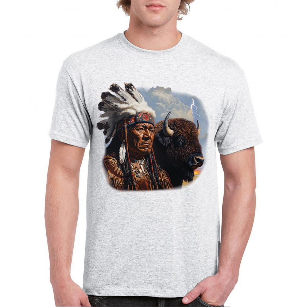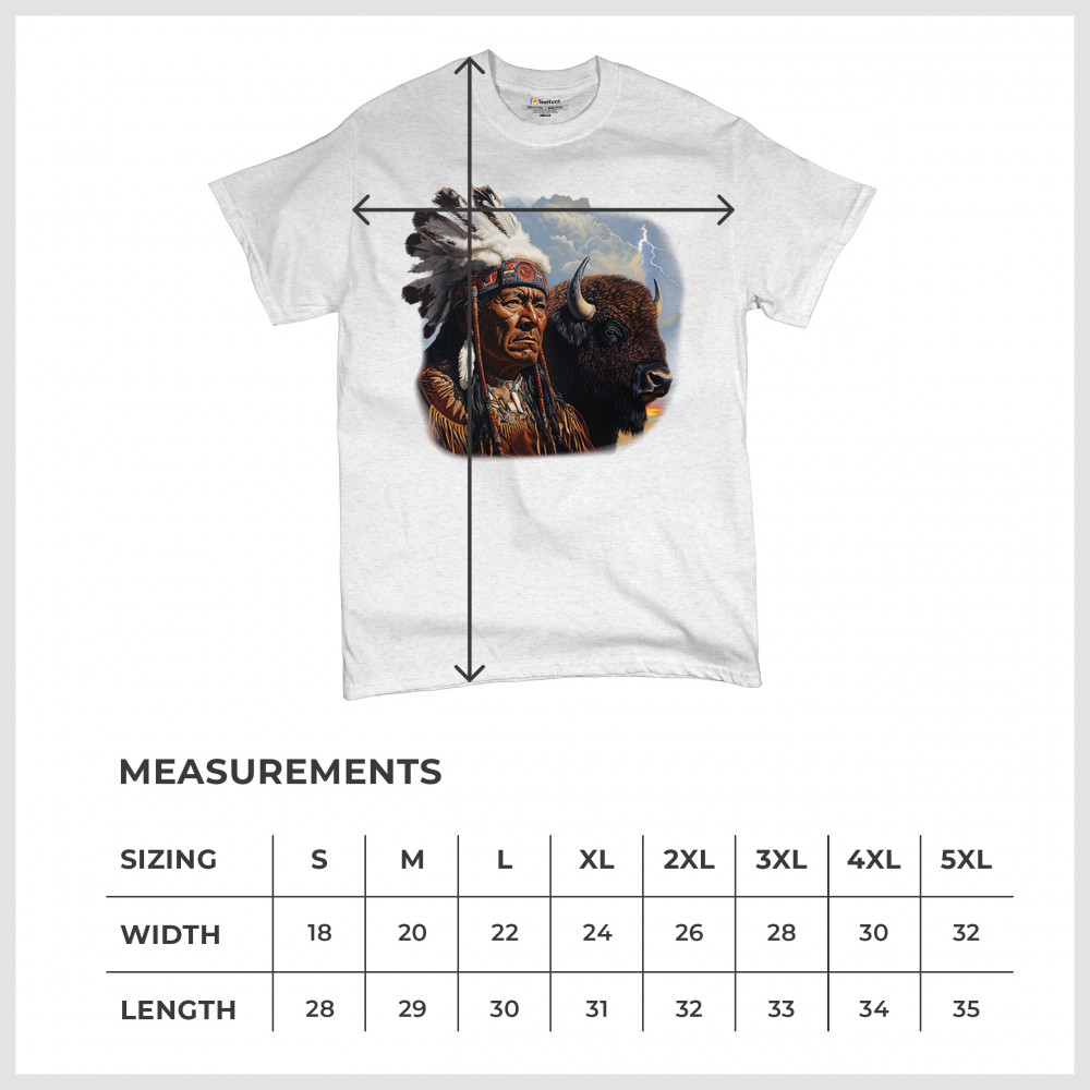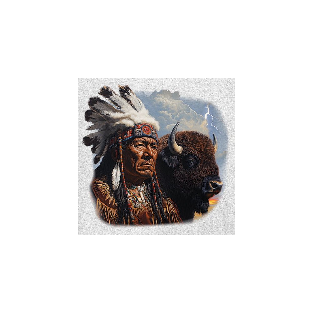 This powerful design features a Native American elder in traditional dress and feathered headdress beside a noble bison. Framed by a stormy sky and lightning, the art symbolizes tribal pride, spiritual harmony, ancestral strength, and a deep connection to nature’s raw energy.