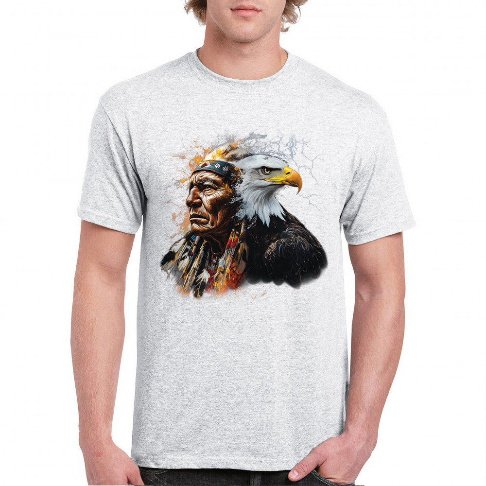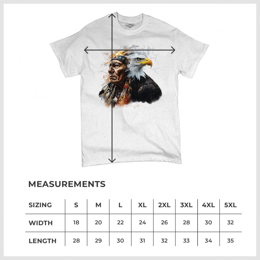 This electrifying design showcases a Native American chief with a bold bald eagle, surrounded by lightning and fire. It blends spiritual animal symbolism with cultural strength and pride. Ideal for admirers of tribal heritage, ancestral energy, and fierce visual storytelling through nature and tradition.