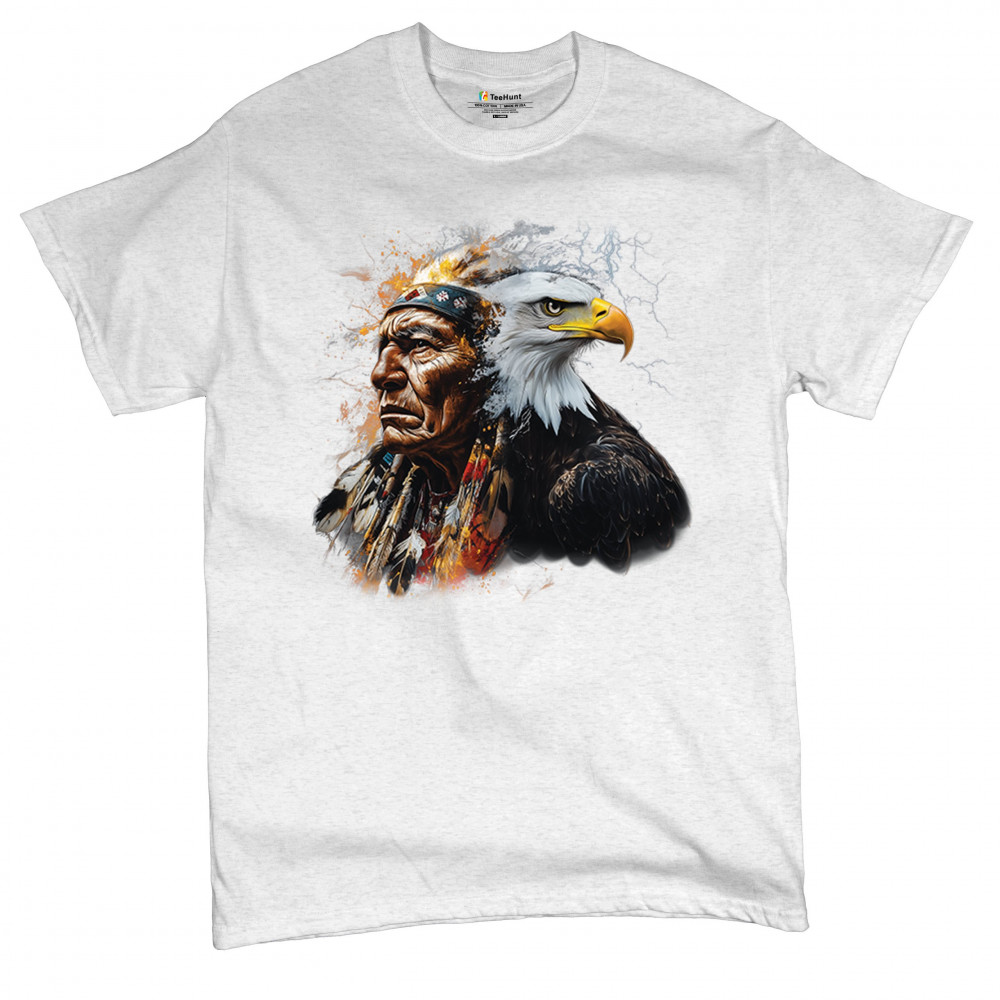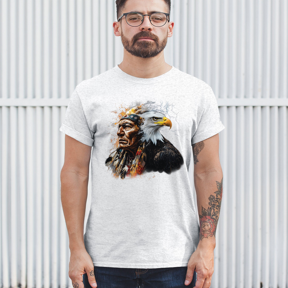 Bold tribal totem design with Native chief, eagle, lightning, and fire. A fierce blend of spirit, power, and cultural pride in one image.
