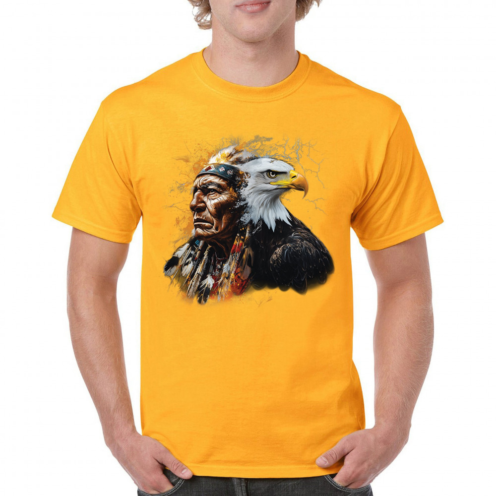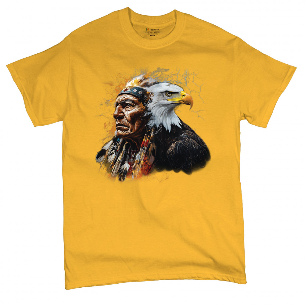 Bold tribal totem design with Native chief, eagle, lightning, and fire. A fierce blend of spirit, power, and cultural pride in one image.