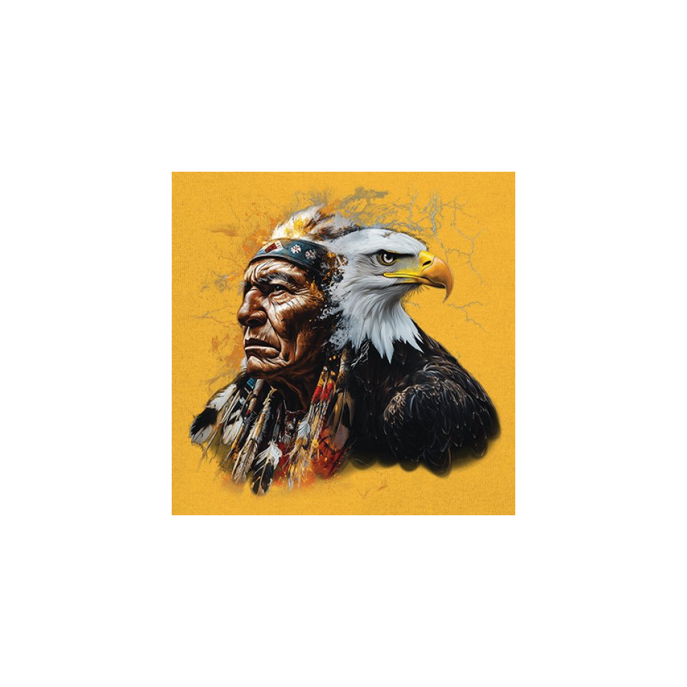 This electrifying design showcases a Native American chief with a bold bald eagle, surrounded by lightning and fire. It blends spiritual animal symbolism with cultural strength and pride. Ideal for admirers of tribal heritage, ancestral energy, and fierce visual storytelling through nature and tradition.