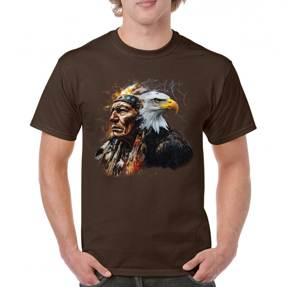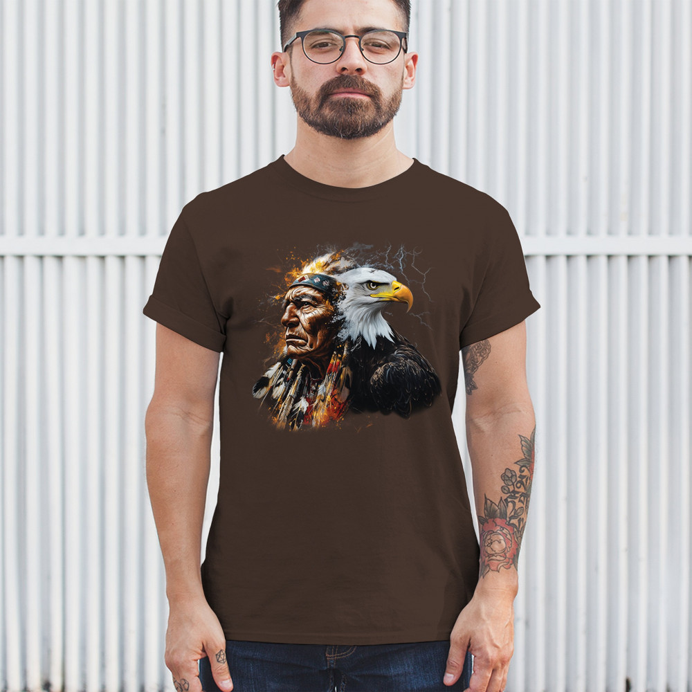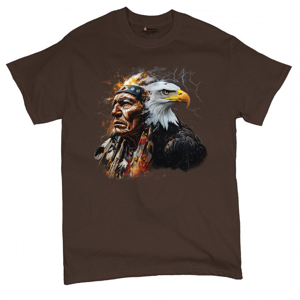 Bold tribal totem design with Native chief, eagle, lightning, and fire. A fierce blend of spirit, power, and cultural pride in one image.