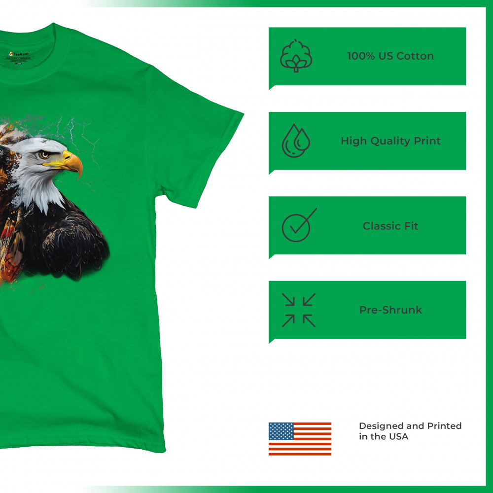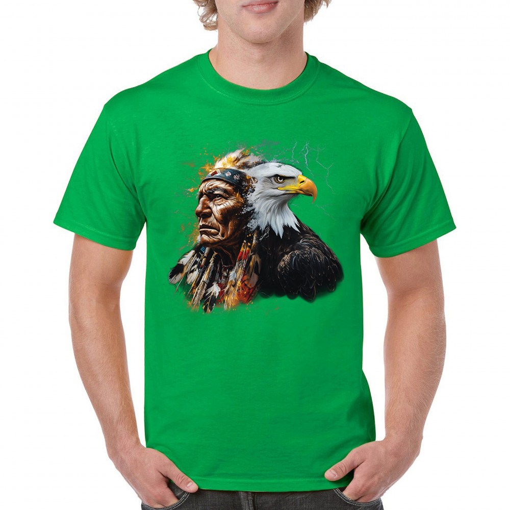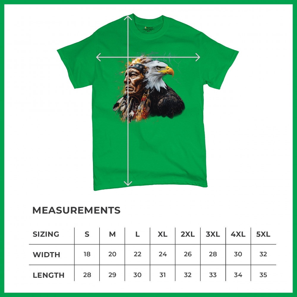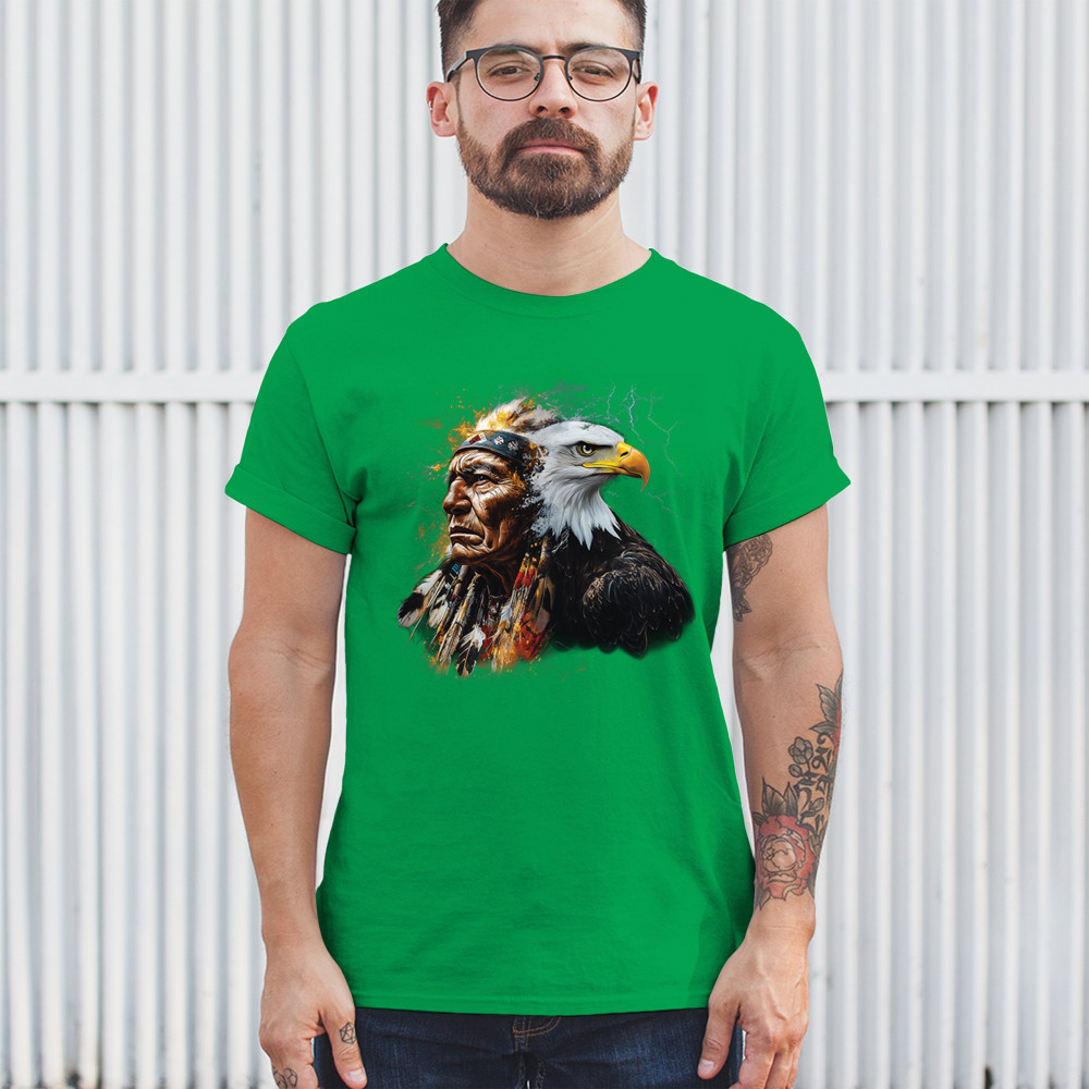 This electrifying design showcases a Native American chief with a bold bald eagle, surrounded by lightning and fire. It blends spiritual animal symbolism with cultural strength and pride. Ideal for admirers of tribal heritage, ancestral energy, and fierce visual storytelling through nature and tradition.
