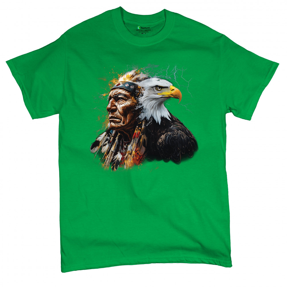 Bold tribal totem design with Native chief, eagle, lightning, and fire. A fierce blend of spirit, power, and cultural pride in one image.