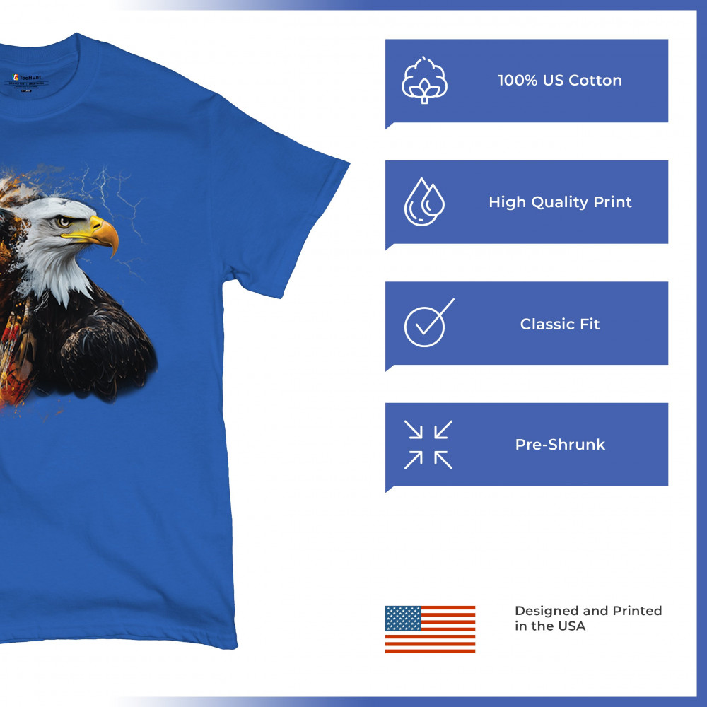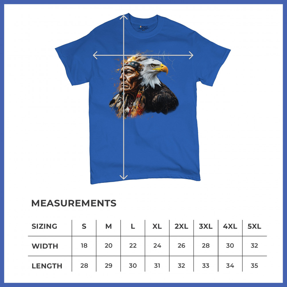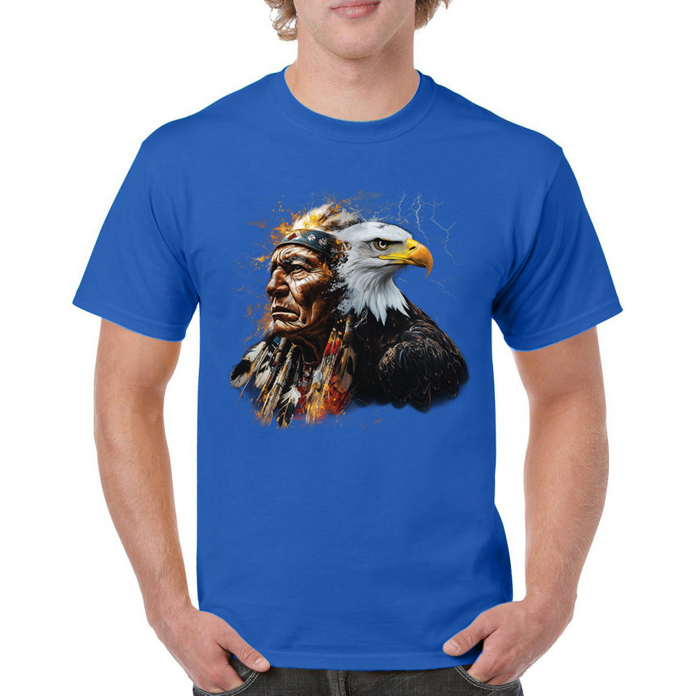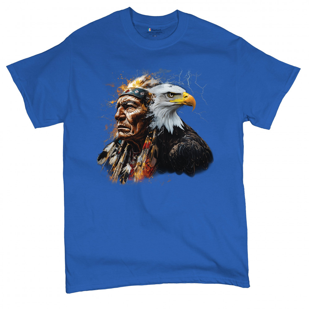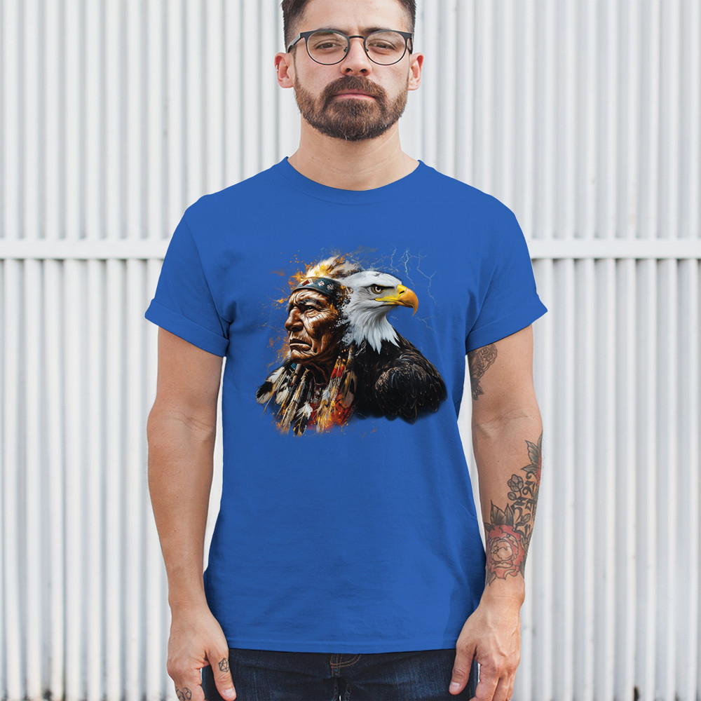 This electrifying design showcases a Native American chief with a bold bald eagle, surrounded by lightning and fire. It blends spiritual animal symbolism with cultural strength and pride. Ideal for admirers of tribal heritage, ancestral energy, and fierce visual storytelling through nature and tradition.