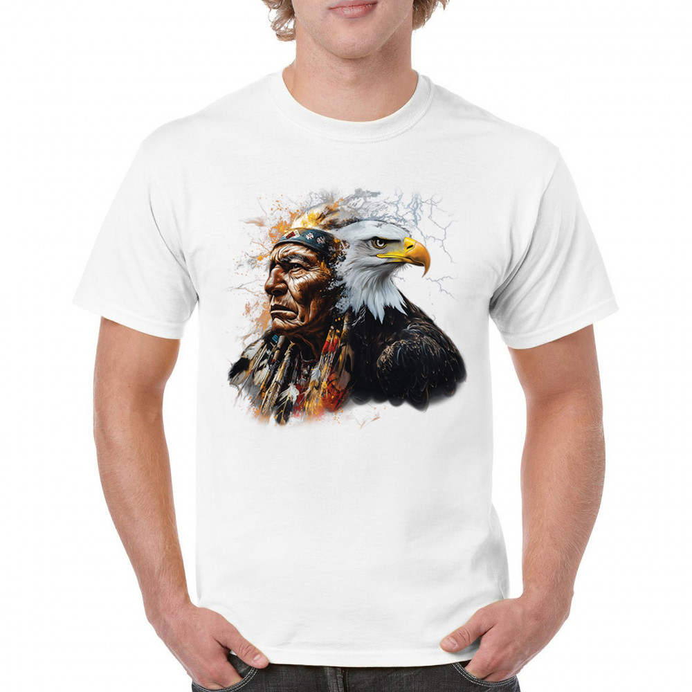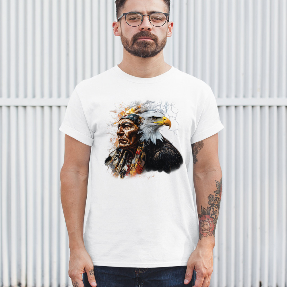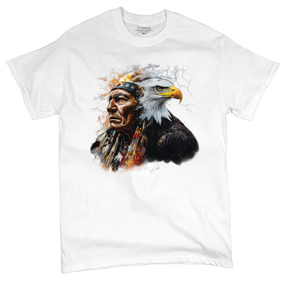 Bold tribal totem design with Native chief, eagle, lightning, and fire. A fierce blend of spirit, power, and cultural pride in one image.