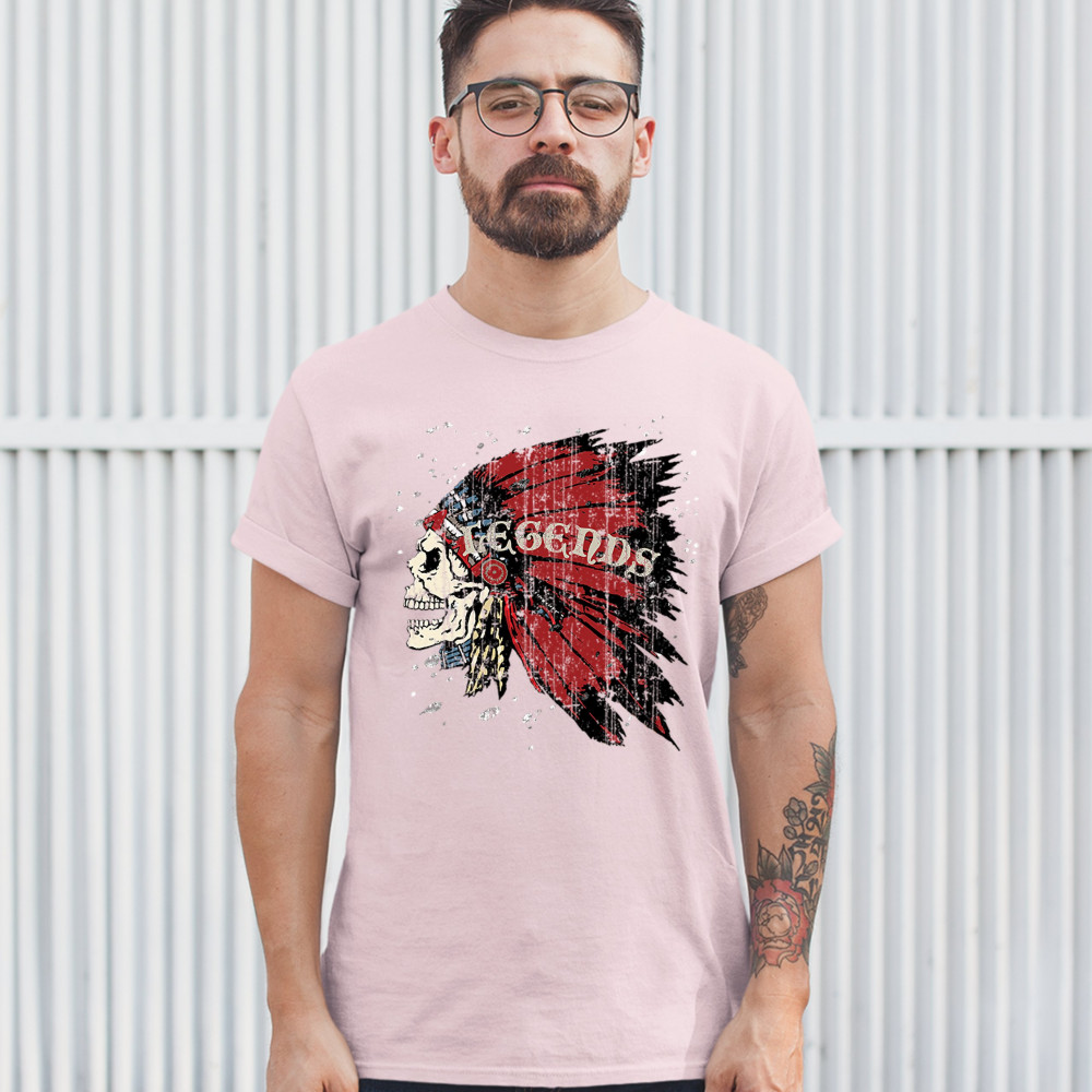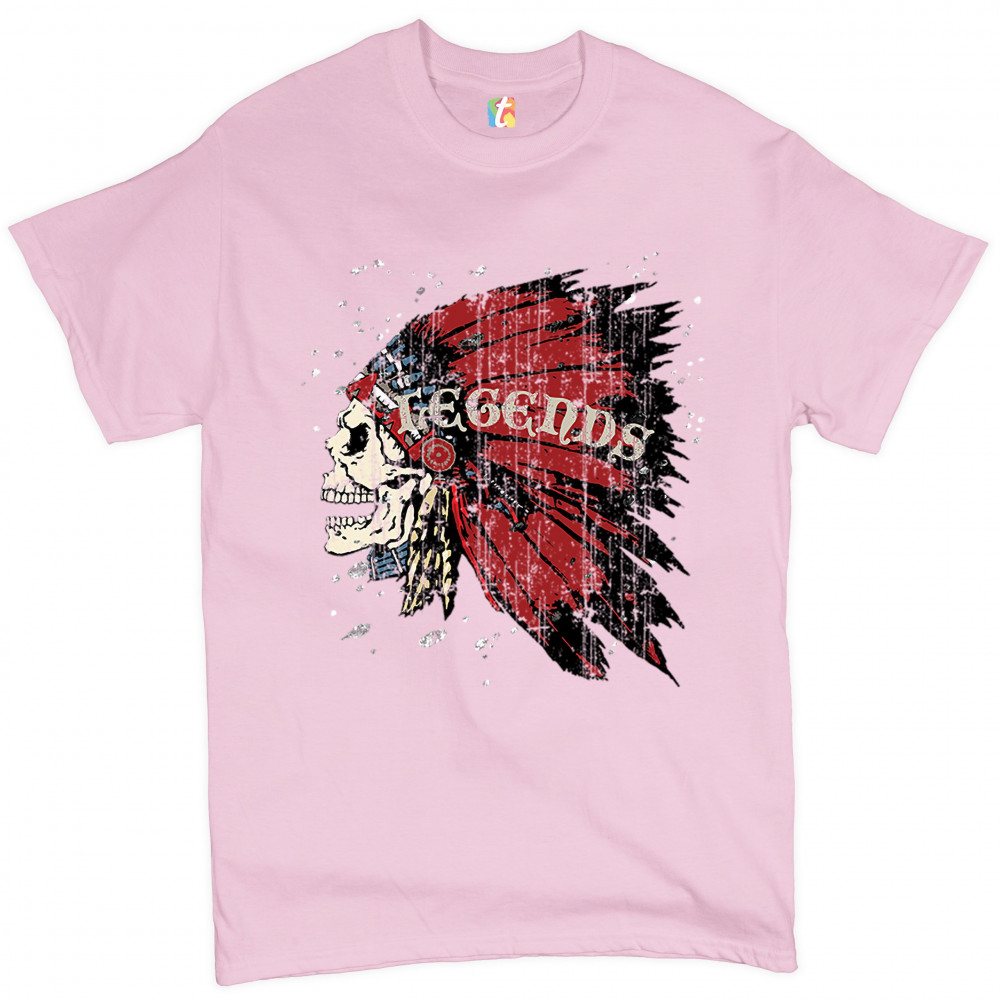 NATIVE AMERICAN LEGENDS t-shirt skull face war bonnet headdress men's tee light pink