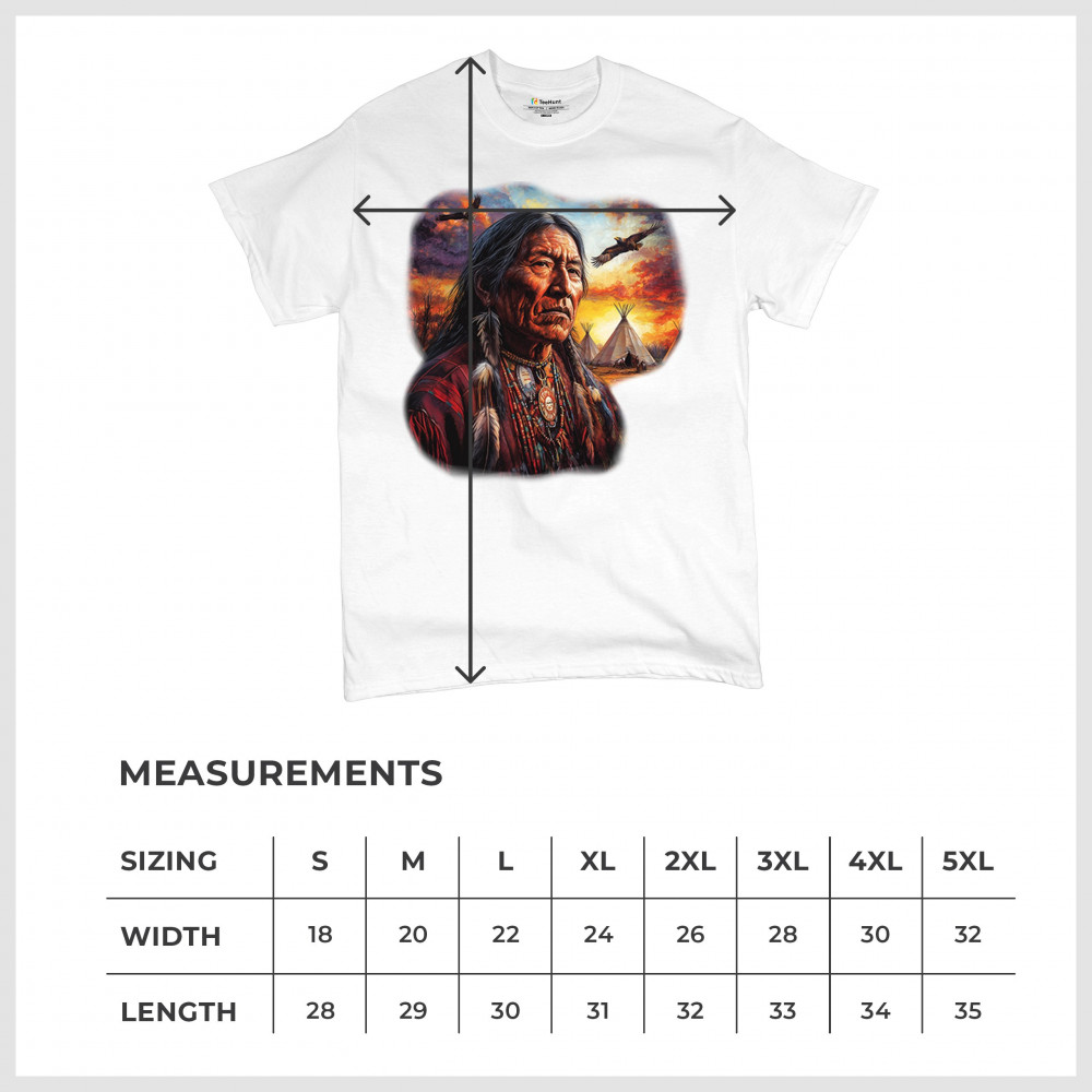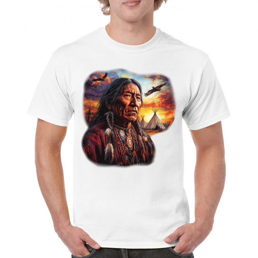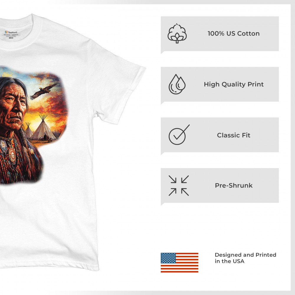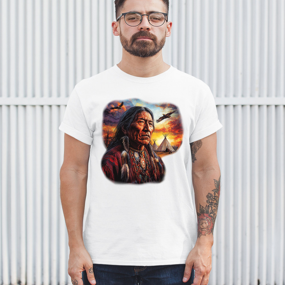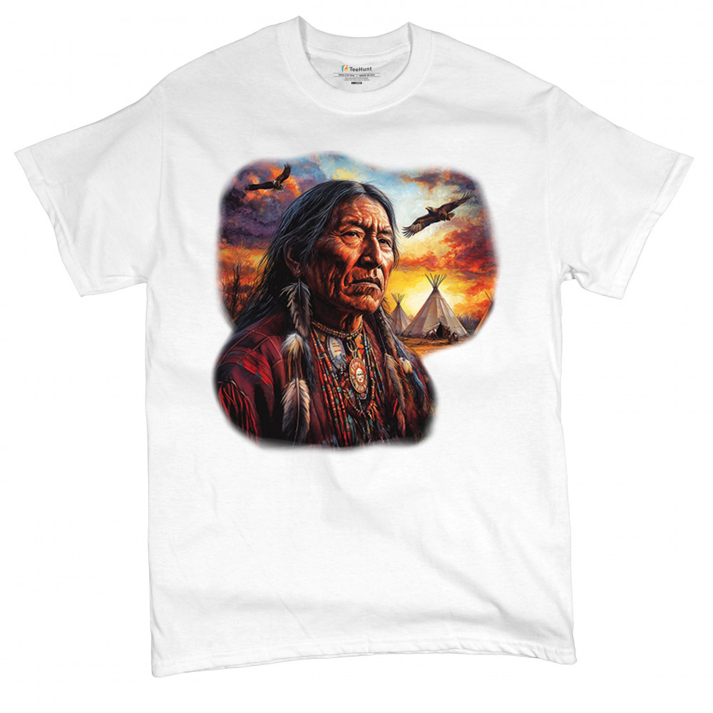 Native elder, teepees, sunset, and eagles come together in this spiritual design celebrating indigenous culture, heritage, and nature’s beauty.