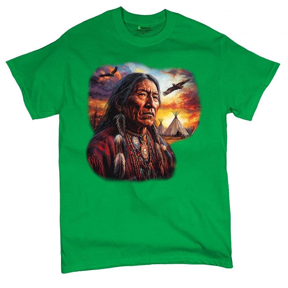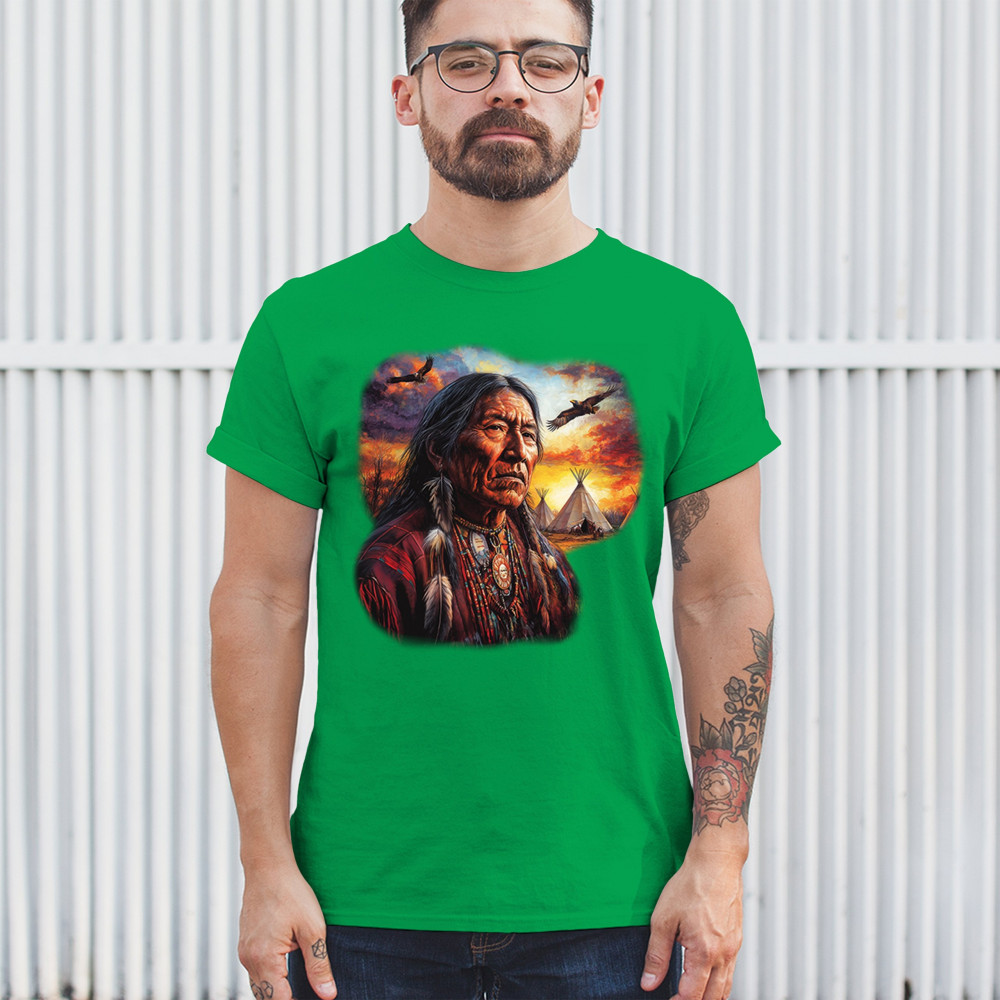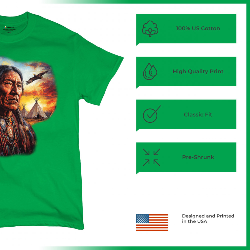 This vivid artwork features a Native American elder in traditional feathered attire, set before a blazing sunset with soaring eagles and peaceful teepees. The scene symbolizes strength, heritage, and spiritual wisdom. A heartfelt tribute to tribal pride, ancestral legacy, and cultural connection to land.