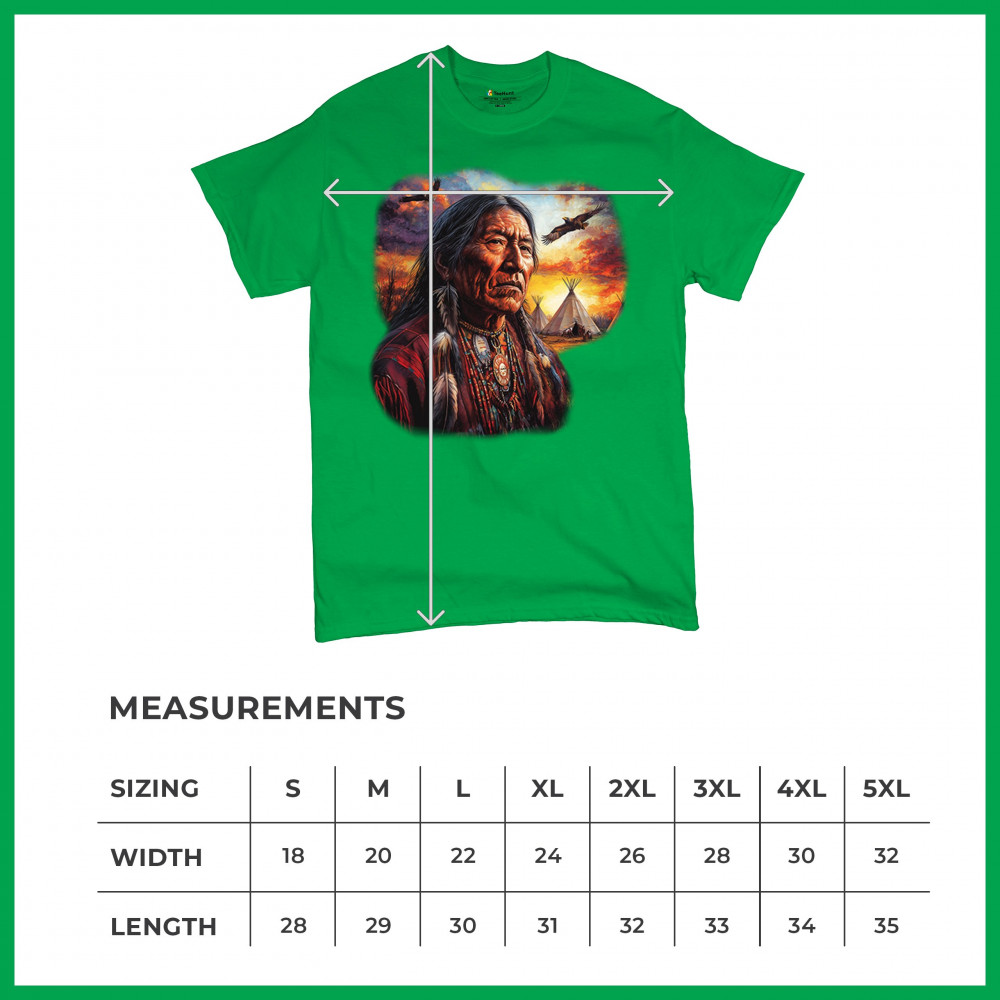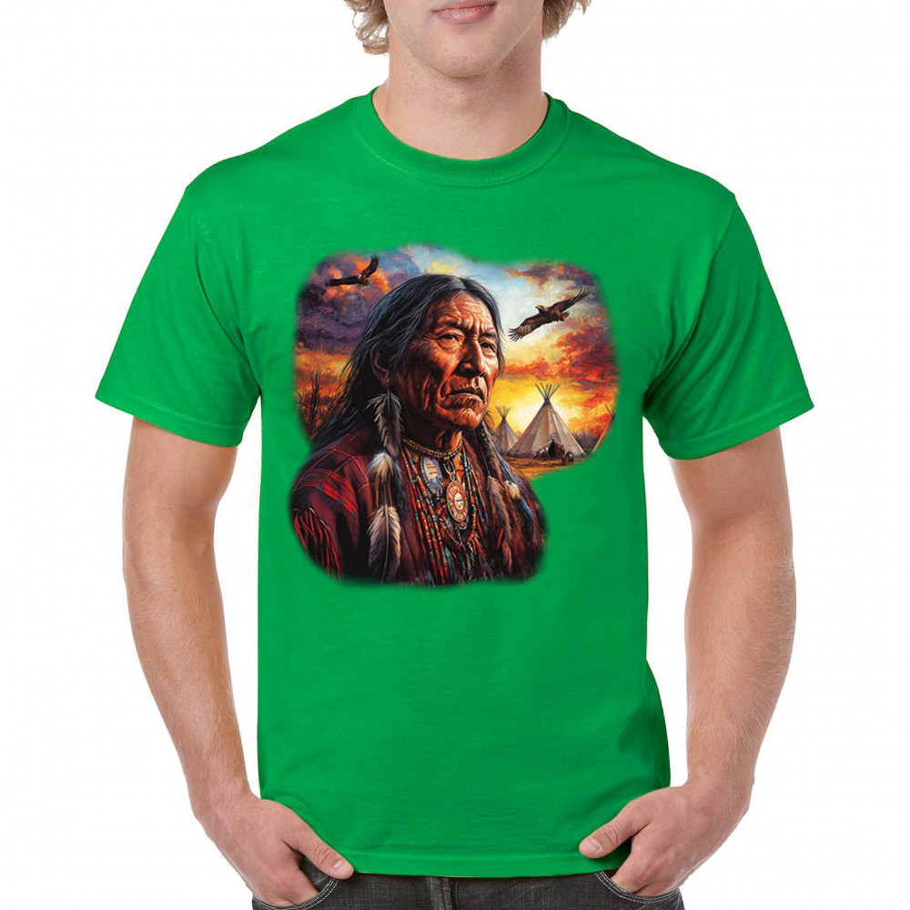 Native elder, teepees, sunset, and eagles come together in this spiritual design celebrating indigenous culture, heritage, and nature’s beauty.