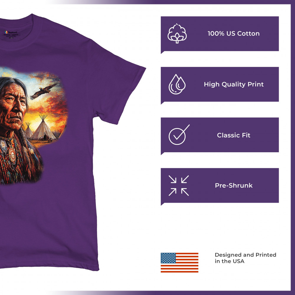 This vivid artwork features a Native American elder in traditional feathered attire, set before a blazing sunset with soaring eagles and peaceful teepees. The scene symbolizes strength, heritage, and spiritual wisdom. A heartfelt tribute to tribal pride, ancestral legacy, and cultural connection to land.
