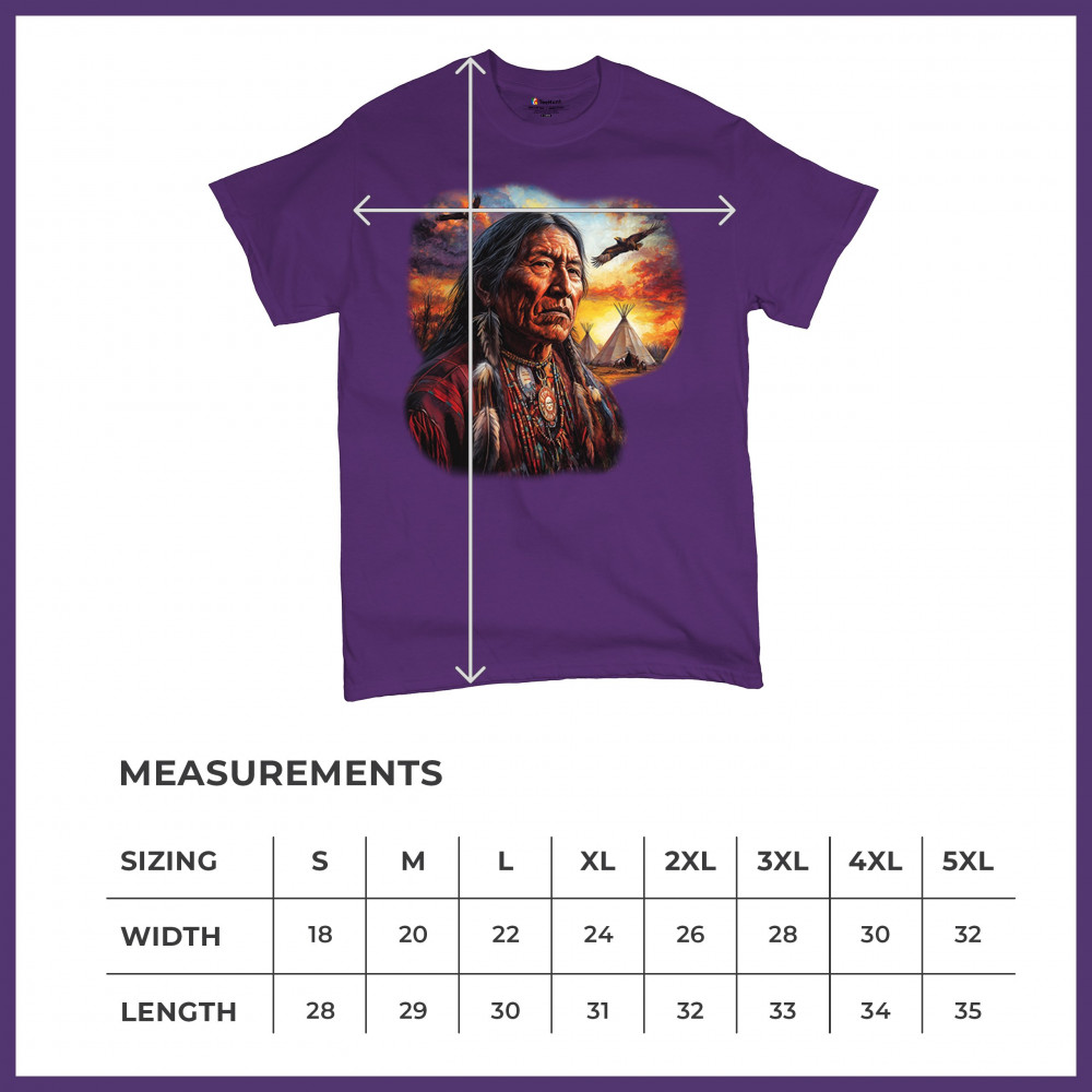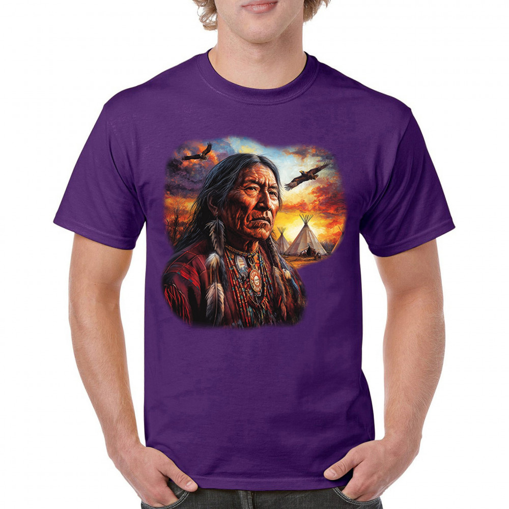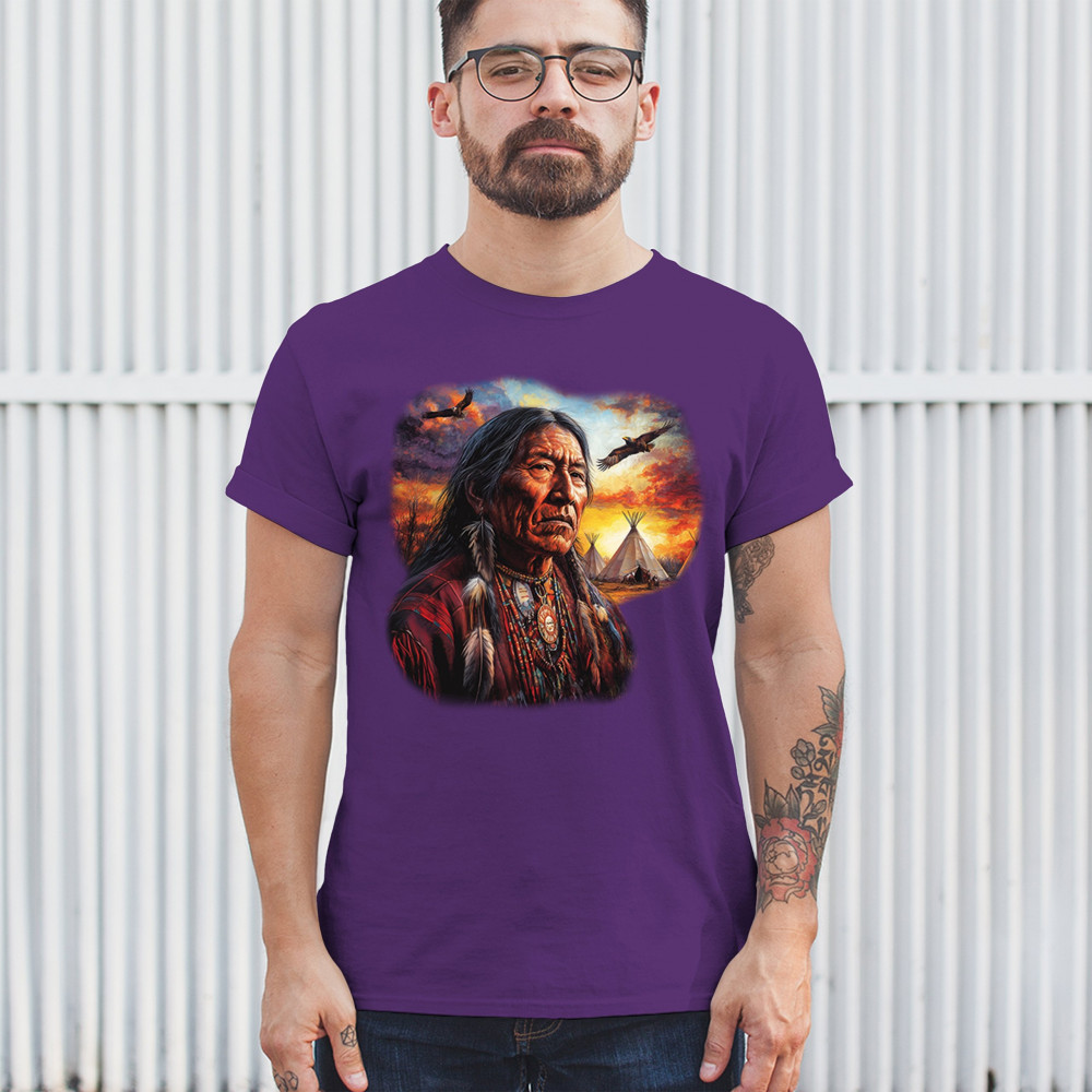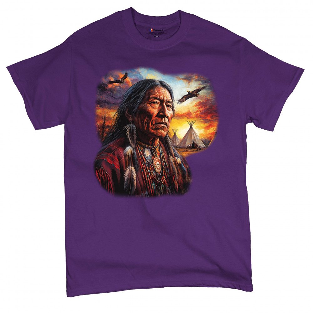 Native elder, teepees, sunset, and eagles come together in this spiritual design celebrating indigenous culture, heritage, and nature’s beauty.