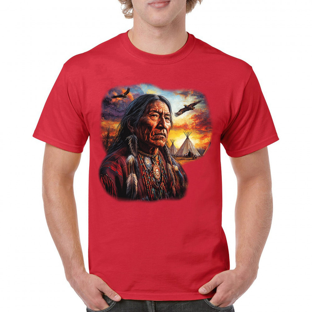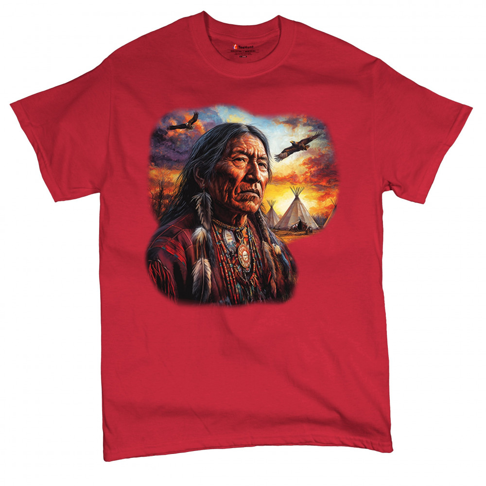 Native elder, teepees, sunset, and eagles come together in this spiritual design celebrating indigenous culture, heritage, and nature’s beauty.