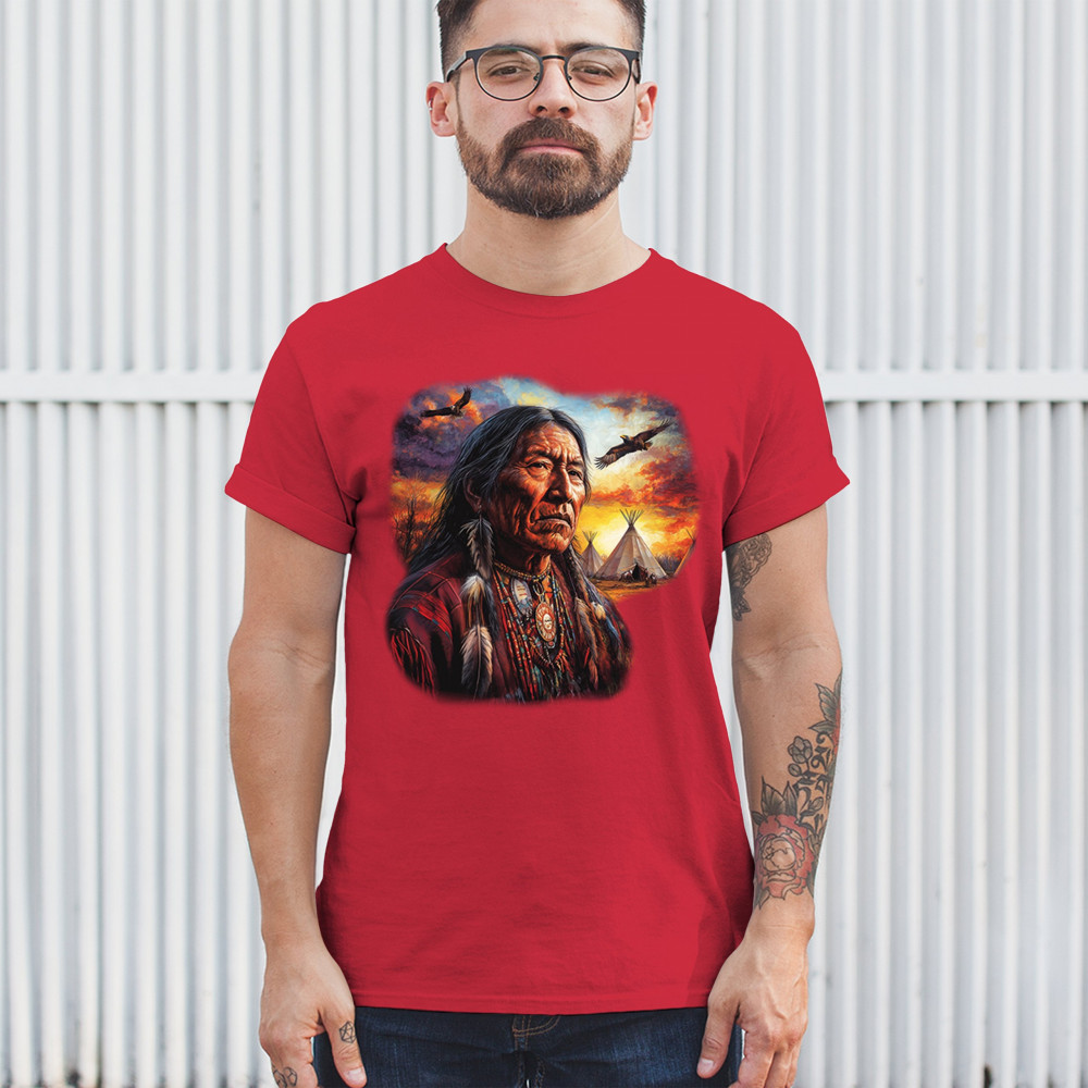 This vivid artwork features a Native American elder in traditional feathered attire, set before a blazing sunset with soaring eagles and peaceful teepees. The scene symbolizes strength, heritage, and spiritual wisdom. A heartfelt tribute to tribal pride, ancestral legacy, and cultural connection to land.
