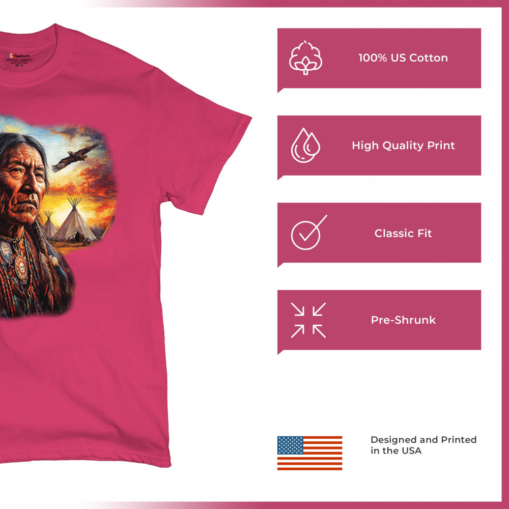 This vivid artwork features a Native American elder in traditional feathered attire, set before a blazing sunset with soaring eagles and peaceful teepees. The scene symbolizes strength, heritage, and spiritual wisdom. A heartfelt tribute to tribal pride, ancestral legacy, and cultural connection to land.