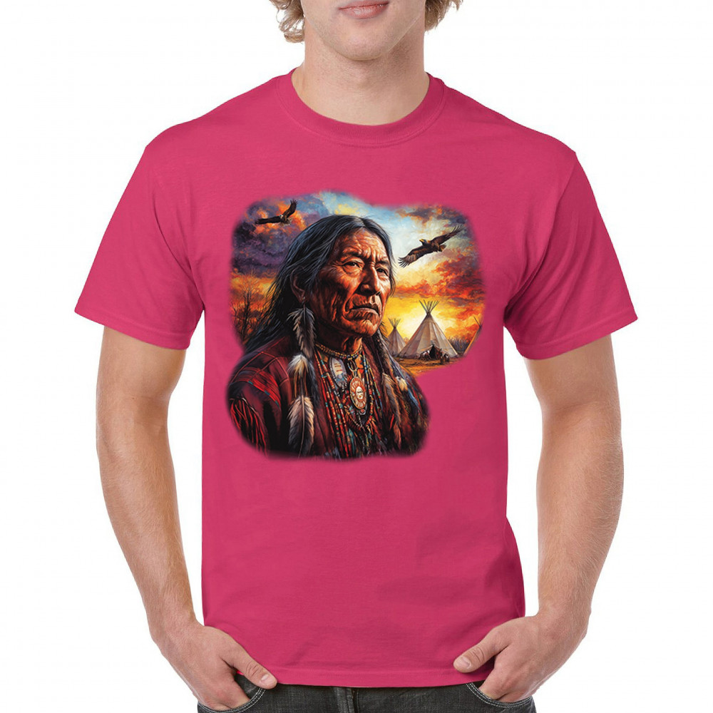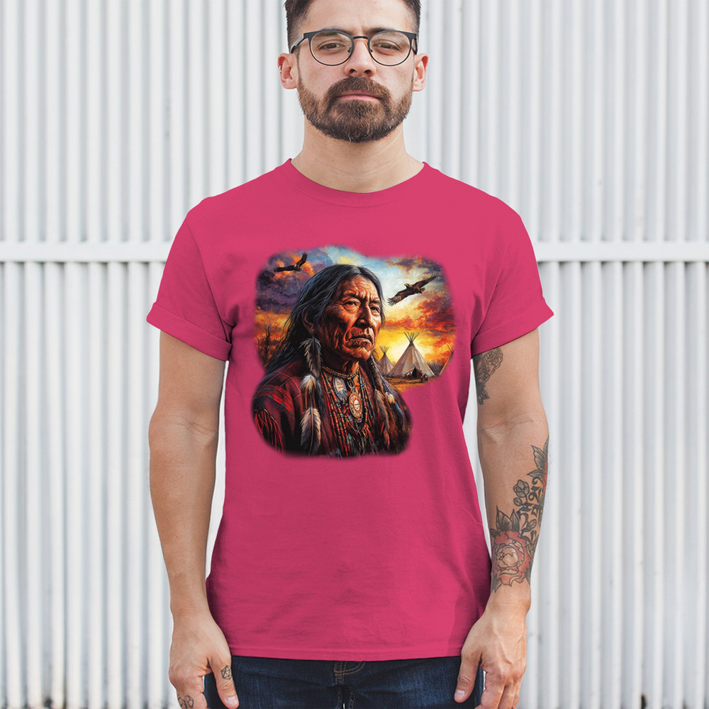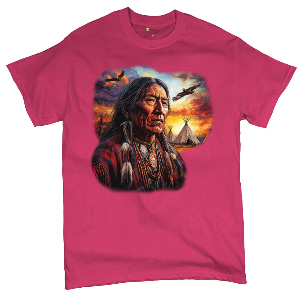 Native elder, teepees, sunset, and eagles come together in this spiritual design celebrating indigenous culture, heritage, and nature’s beauty.