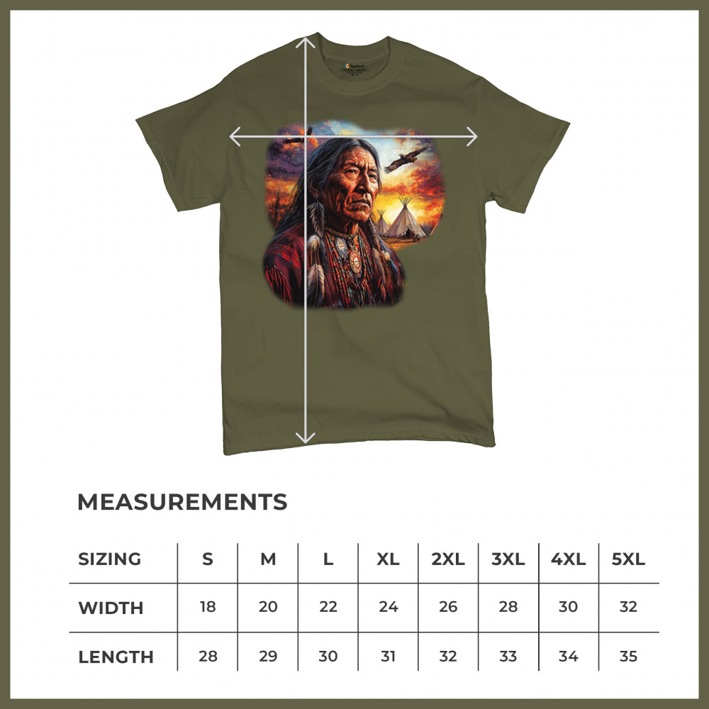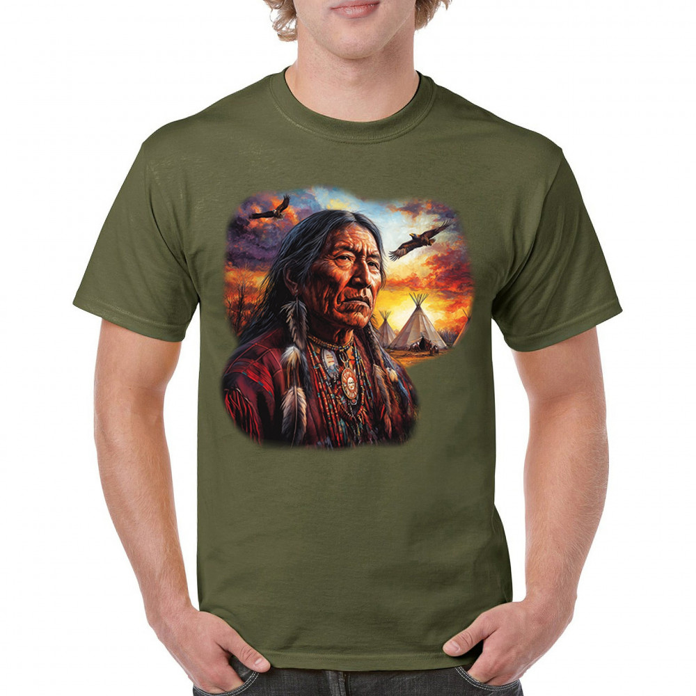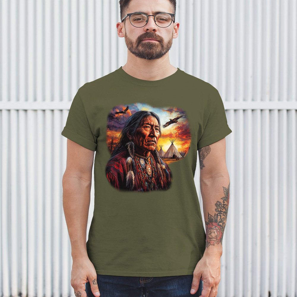 Native elder, teepees, sunset, and eagles come together in this spiritual design celebrating indigenous culture, heritage, and nature’s beauty.