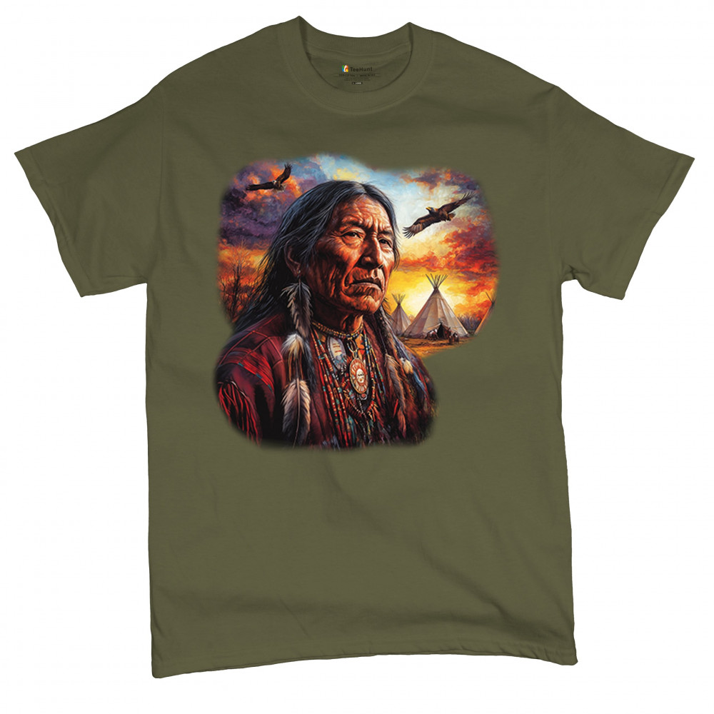 This vivid artwork features a Native American elder in traditional feathered attire, set before a blazing sunset with soaring eagles and peaceful teepees. The scene symbolizes strength, heritage, and spiritual wisdom. A heartfelt tribute to tribal pride, ancestral legacy, and cultural connection to land.