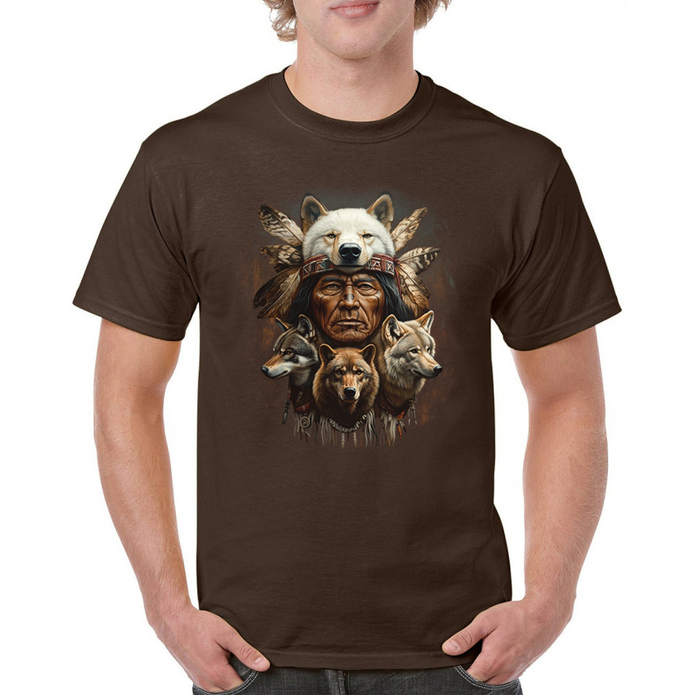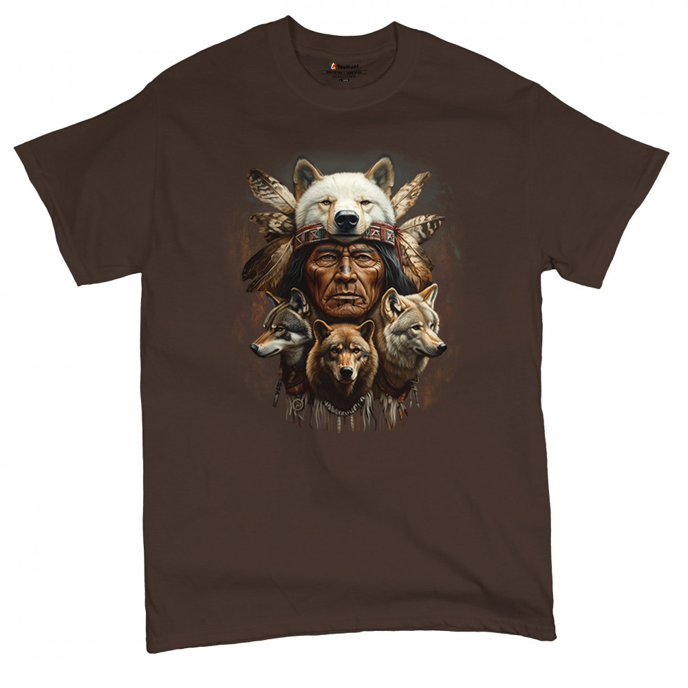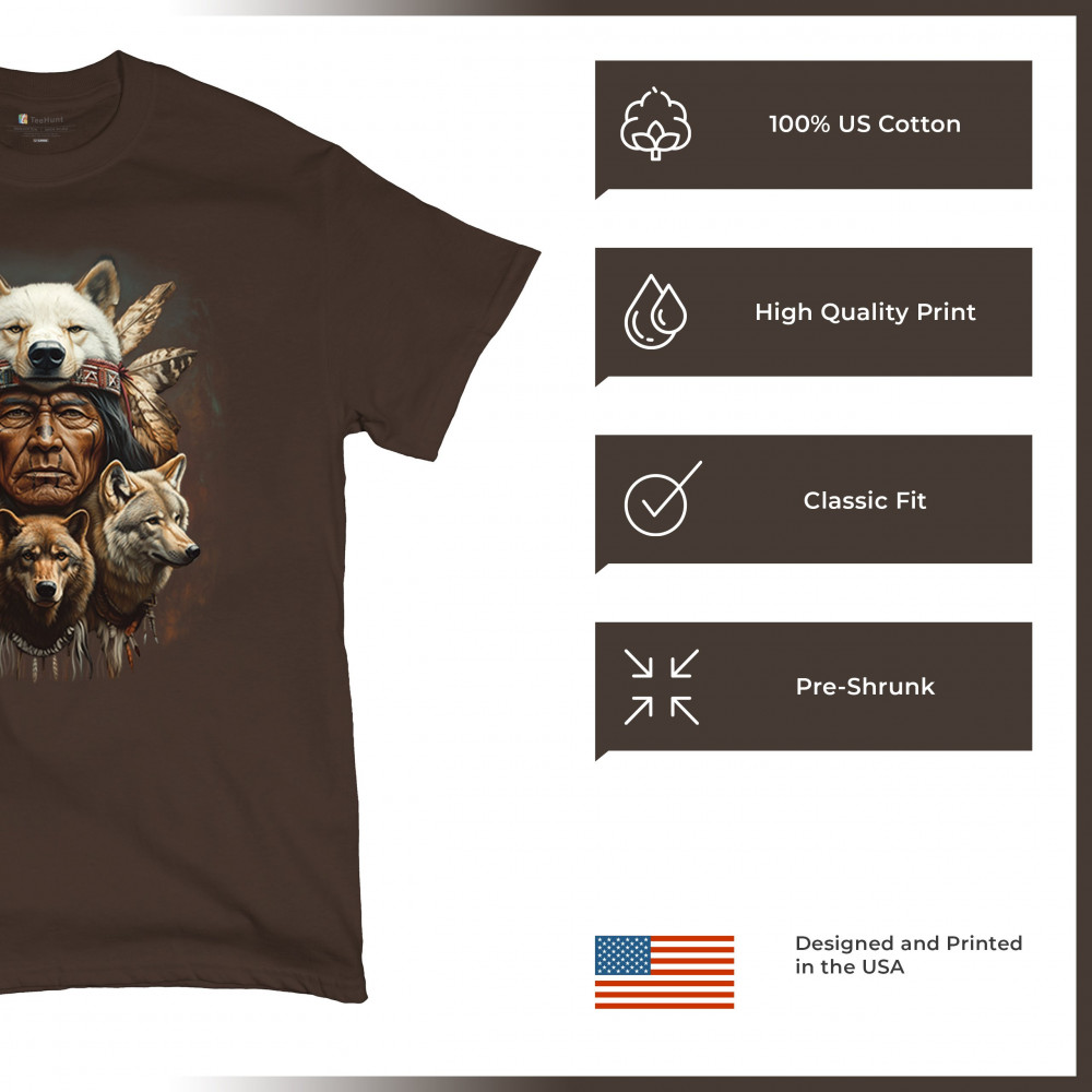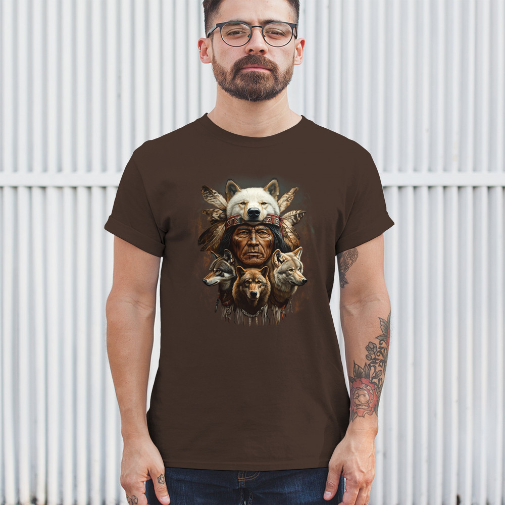 Wolf totem design with Native elder in headdress and guardian wolves. Symbolizes strength, loyalty, spirit animals, and tribal heritage.