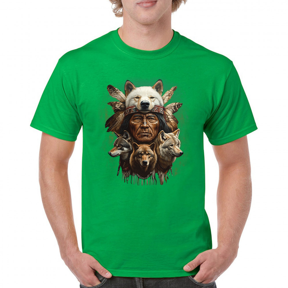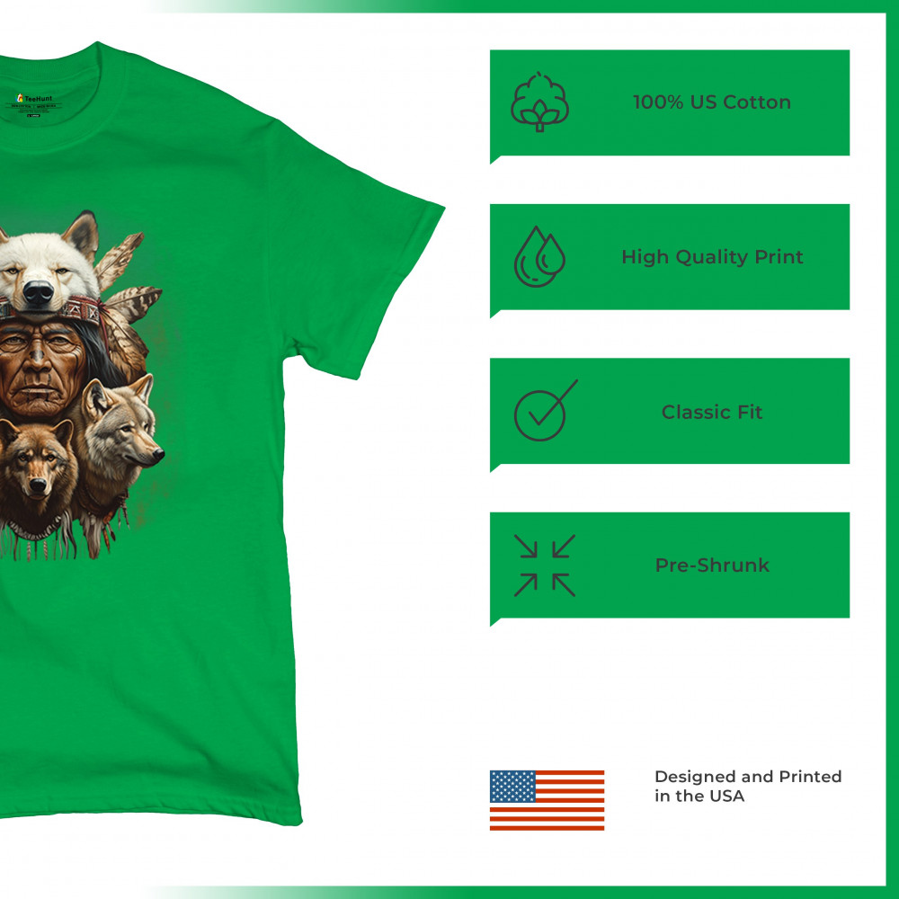 Wolf totem design with Native elder in headdress and guardian wolves. Symbolizes strength, loyalty, spirit animals, and tribal heritage.