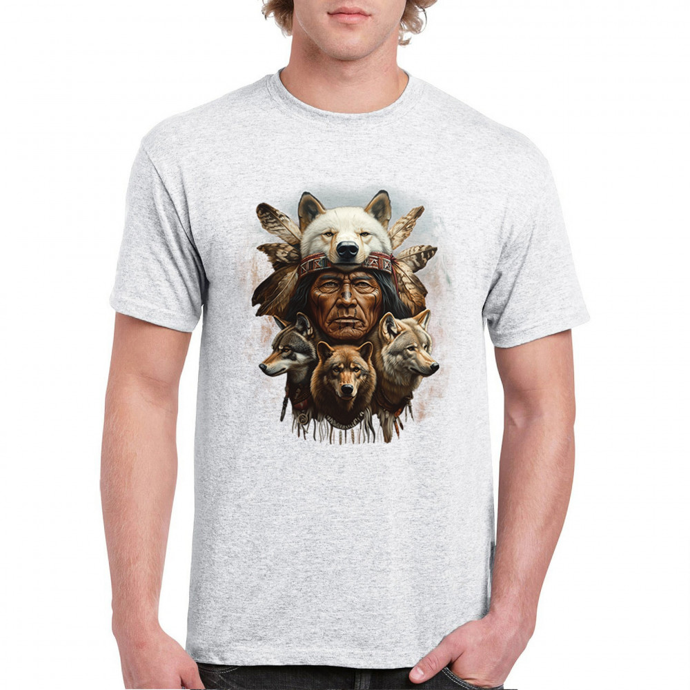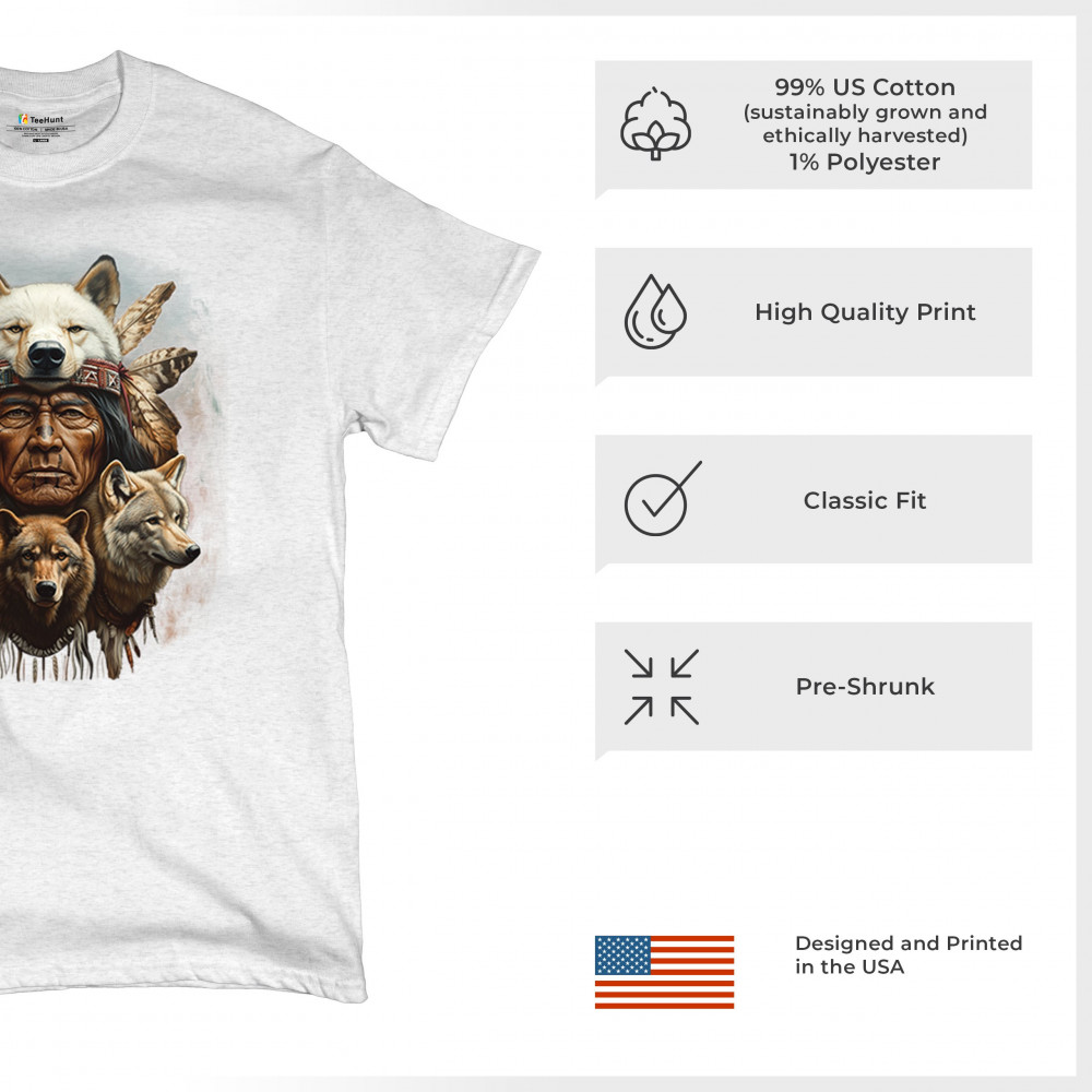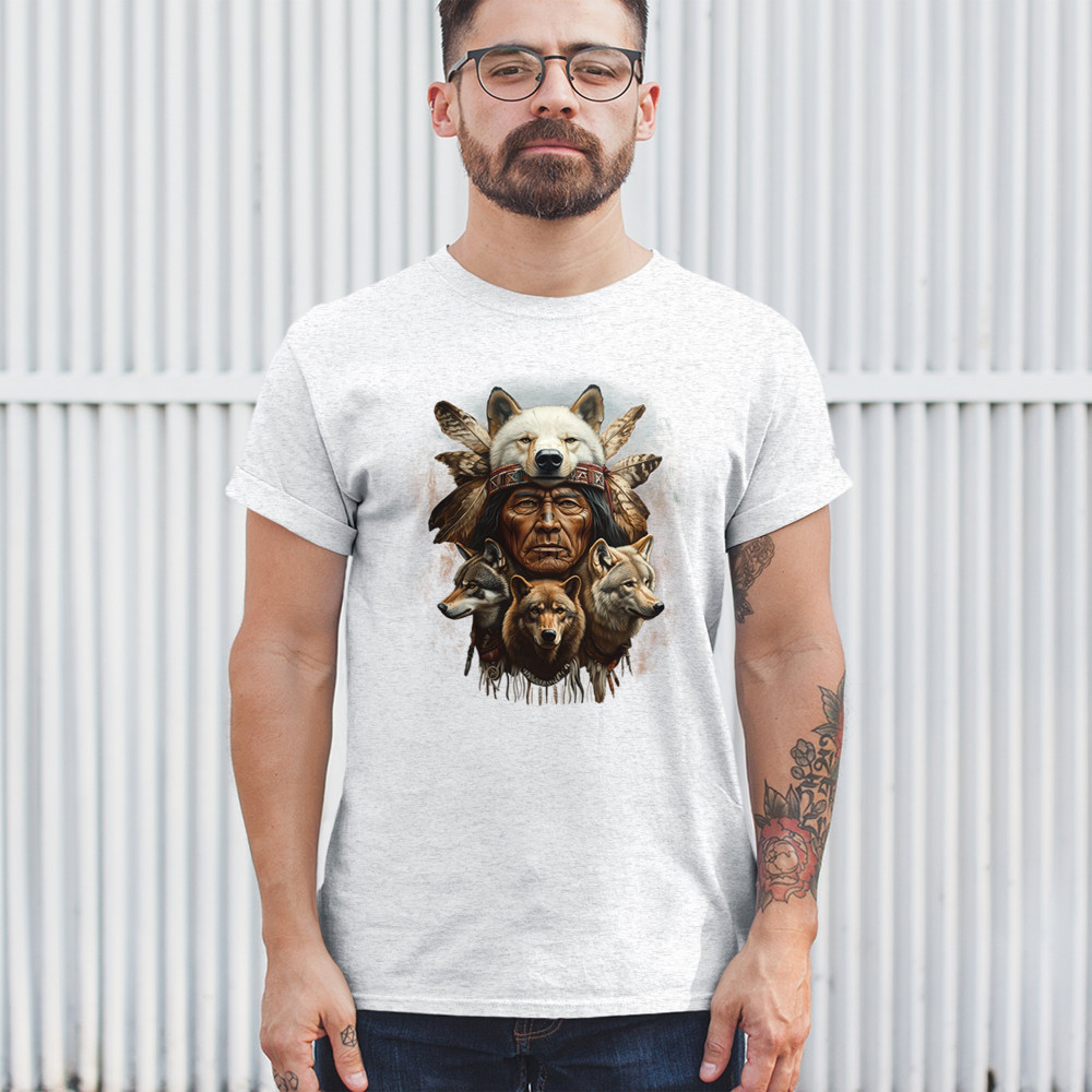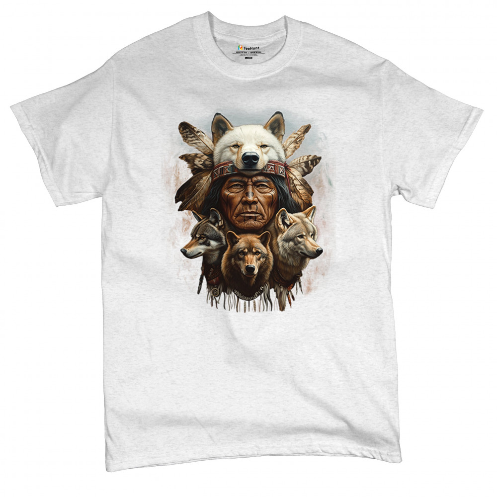 Wolf totem design with Native elder in headdress and guardian wolves. Symbolizes strength, loyalty, spirit animals, and tribal heritage.