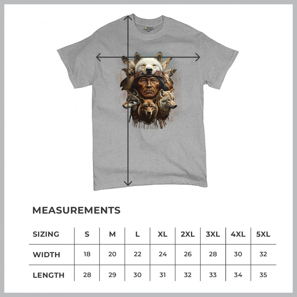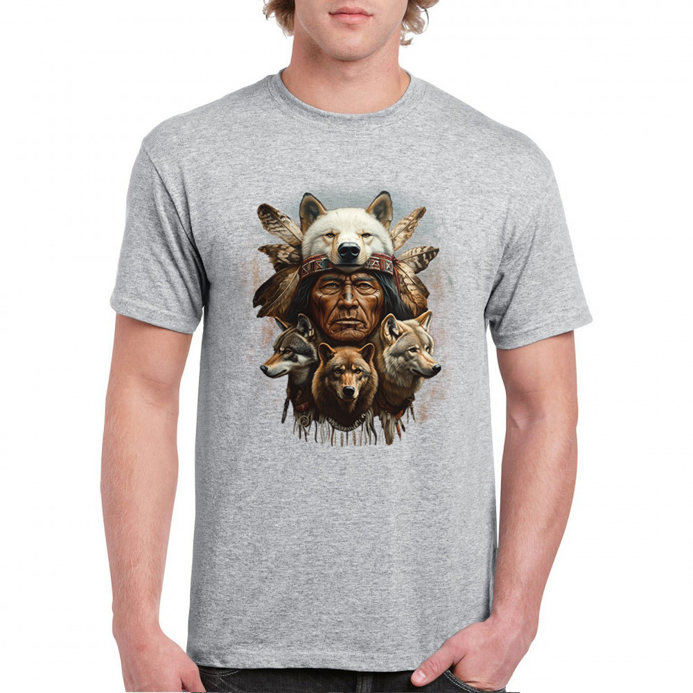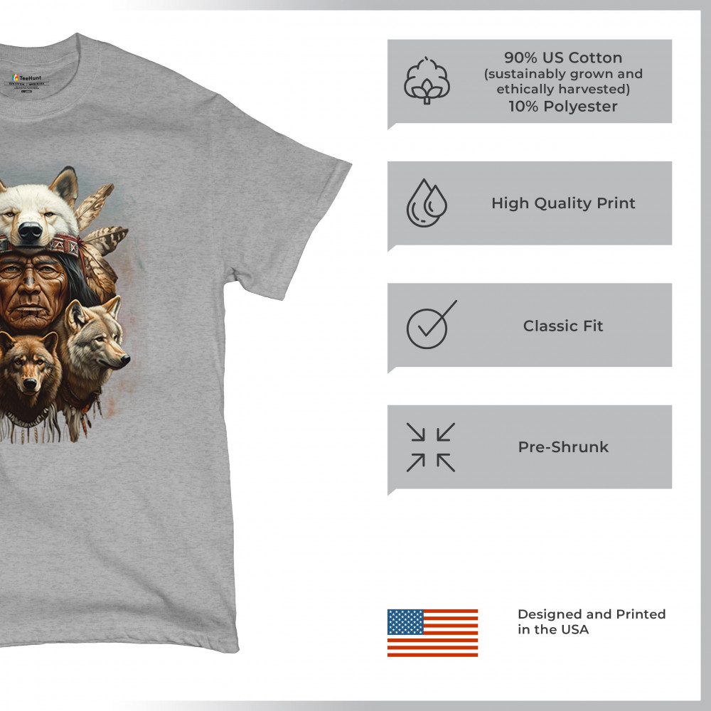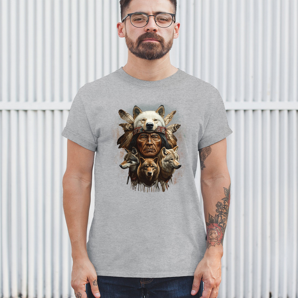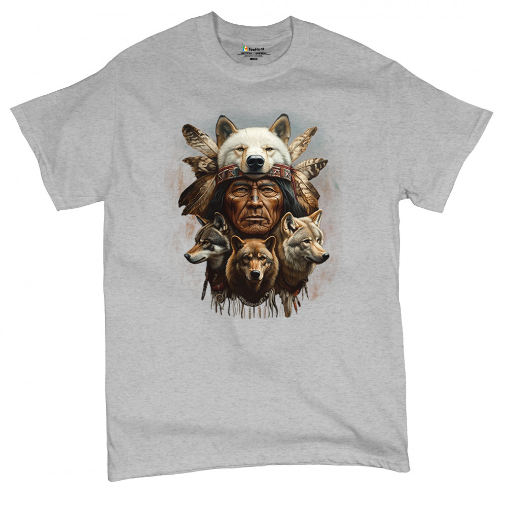 Wolf totem design with Native elder in headdress and guardian wolves. Symbolizes strength, loyalty, spirit animals, and tribal heritage.