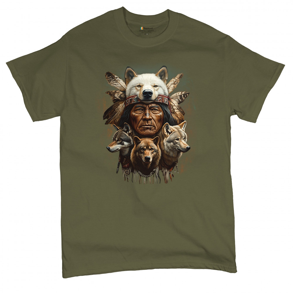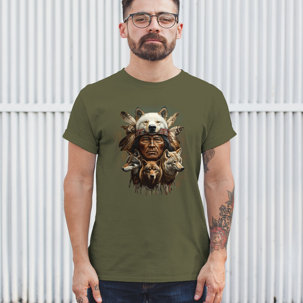Wolf totem design with Native elder in headdress and guardian wolves. Symbolizes strength, loyalty, spirit animals, and tribal heritage.