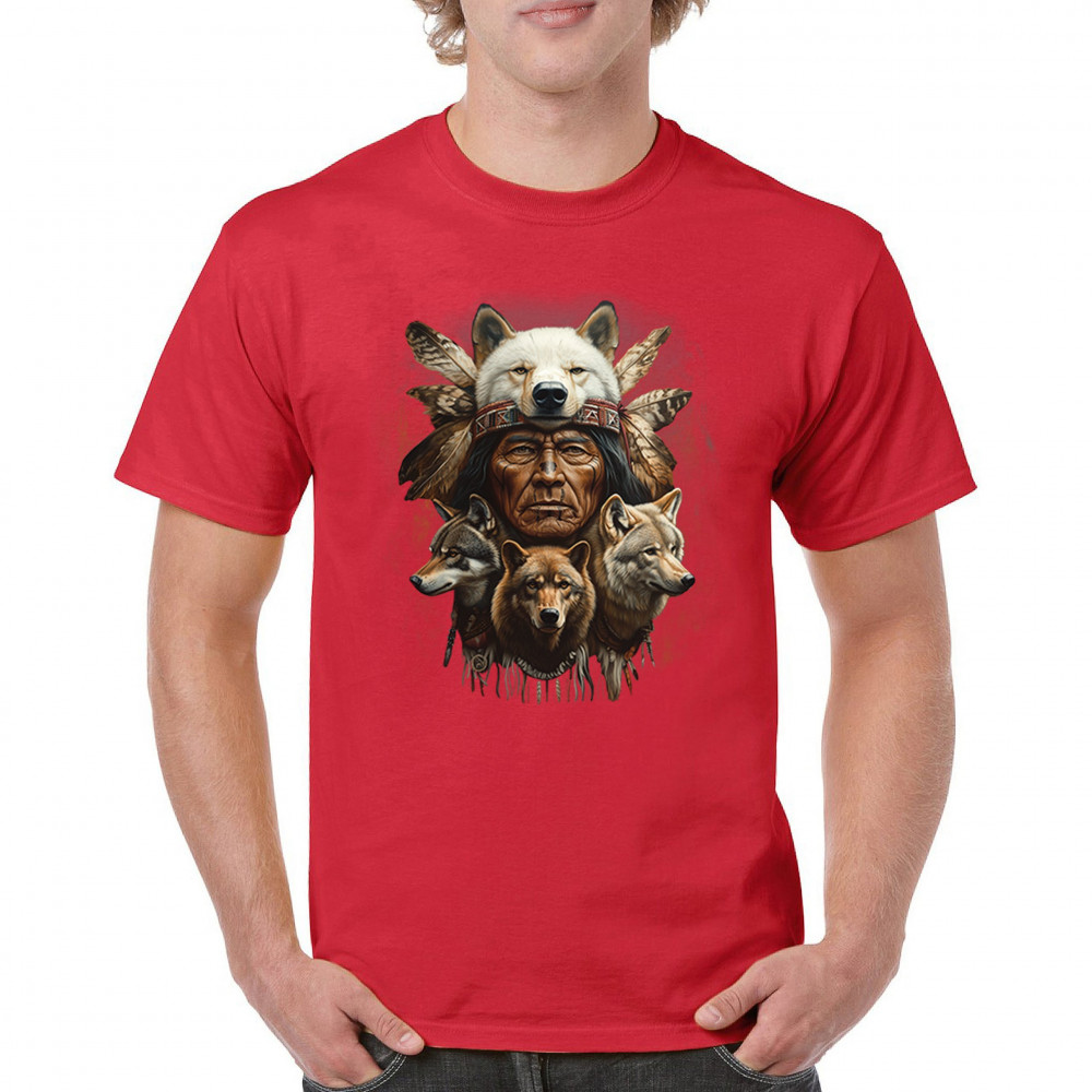 Wolf totem design with Native elder in headdress and guardian wolves. Symbolizes strength, loyalty, spirit animals, and tribal heritage.