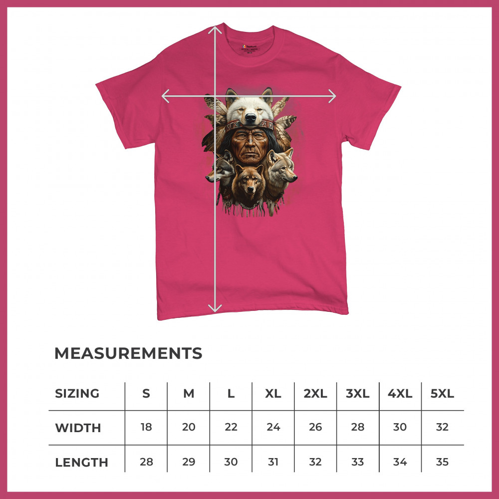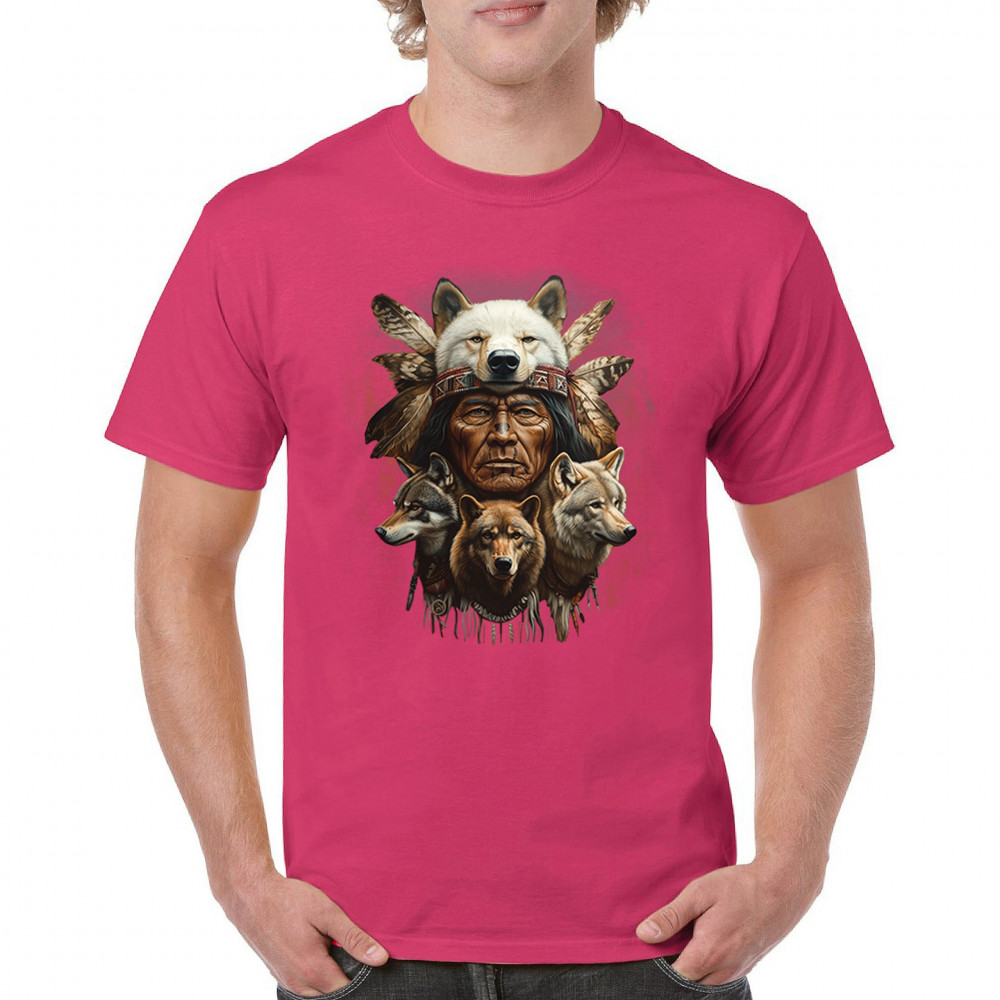 This spiritual tribal design showcases a Native American elder in a detailed wolf headdress surrounded by guardian wolves. It represents strength, loyalty, instinct, and sacred unity with nature. A powerful totem for honoring animal bonds, native pride, and ancestral spiritual guidance through the spirit of the wolf.