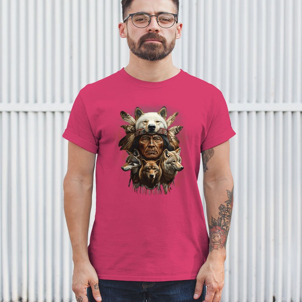 Wolf totem design with Native elder in headdress and guardian wolves. Symbolizes strength, loyalty, spirit animals, and tribal heritage.