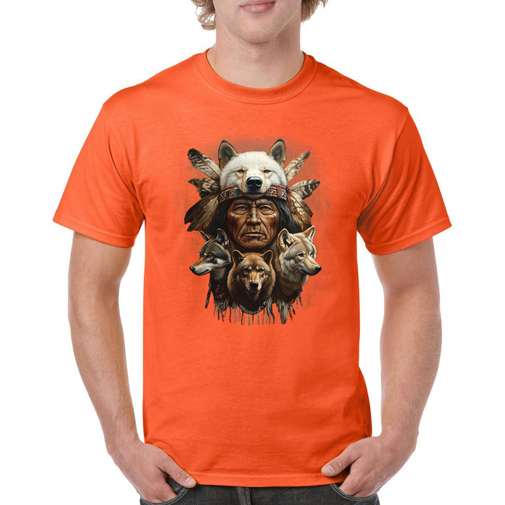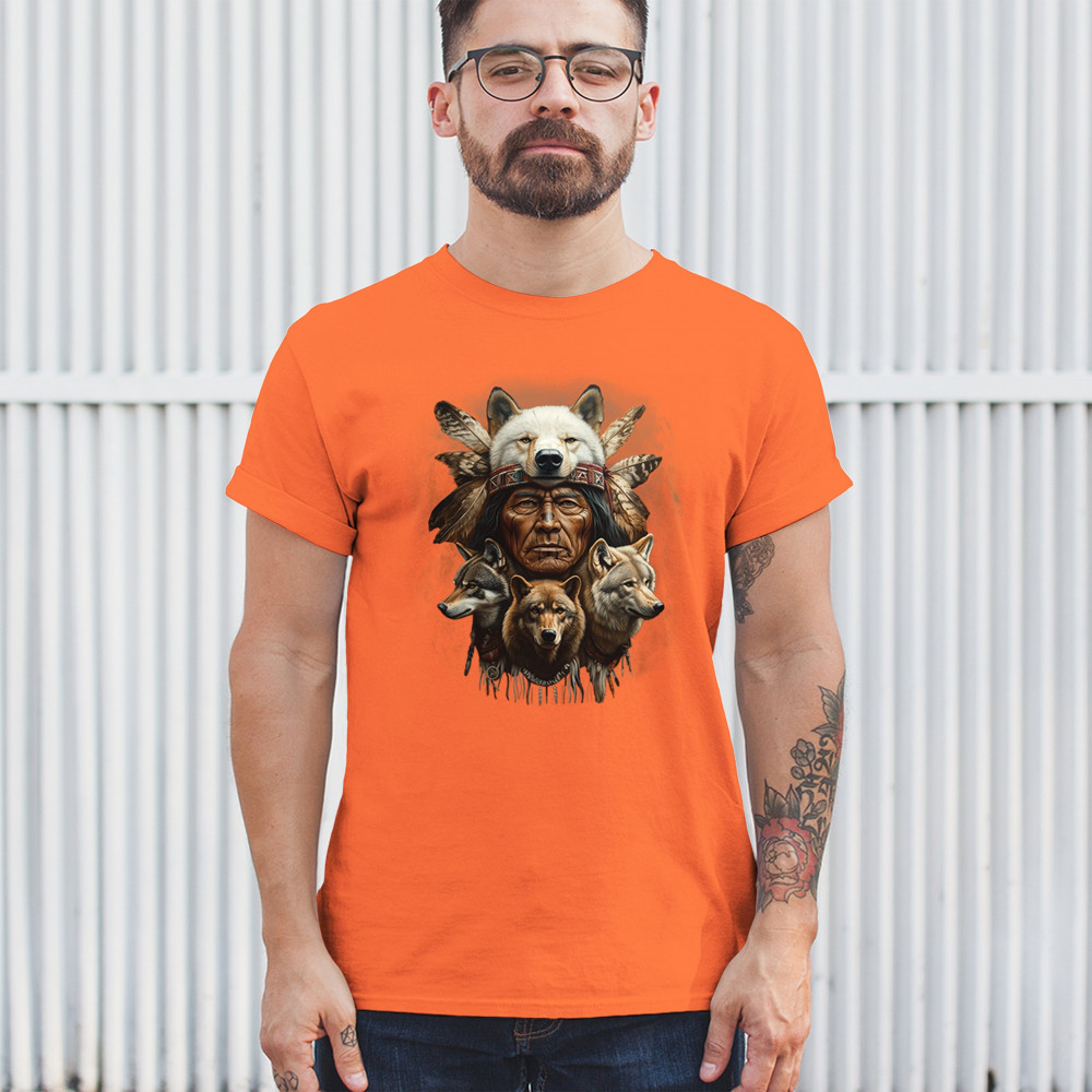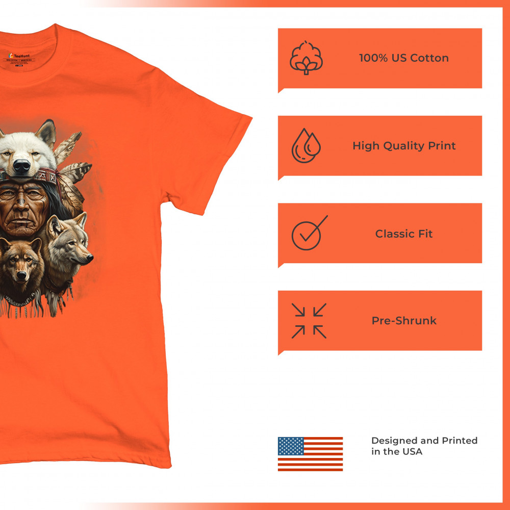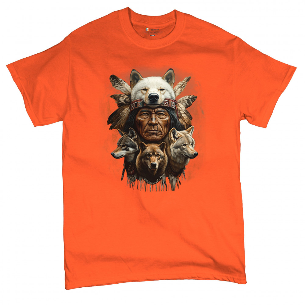 This spiritual tribal design showcases a Native American elder in a detailed wolf headdress surrounded by guardian wolves. It represents strength, loyalty, instinct, and sacred unity with nature. A powerful totem for honoring animal bonds, native pride, and ancestral spiritual guidance through the spirit of the wolf.