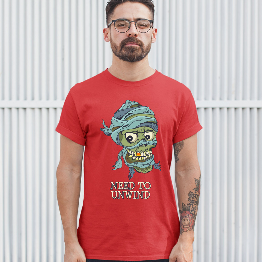 NEED TO UNWIND t-shirt funny halloween zombie trick-or-treat men's tee red