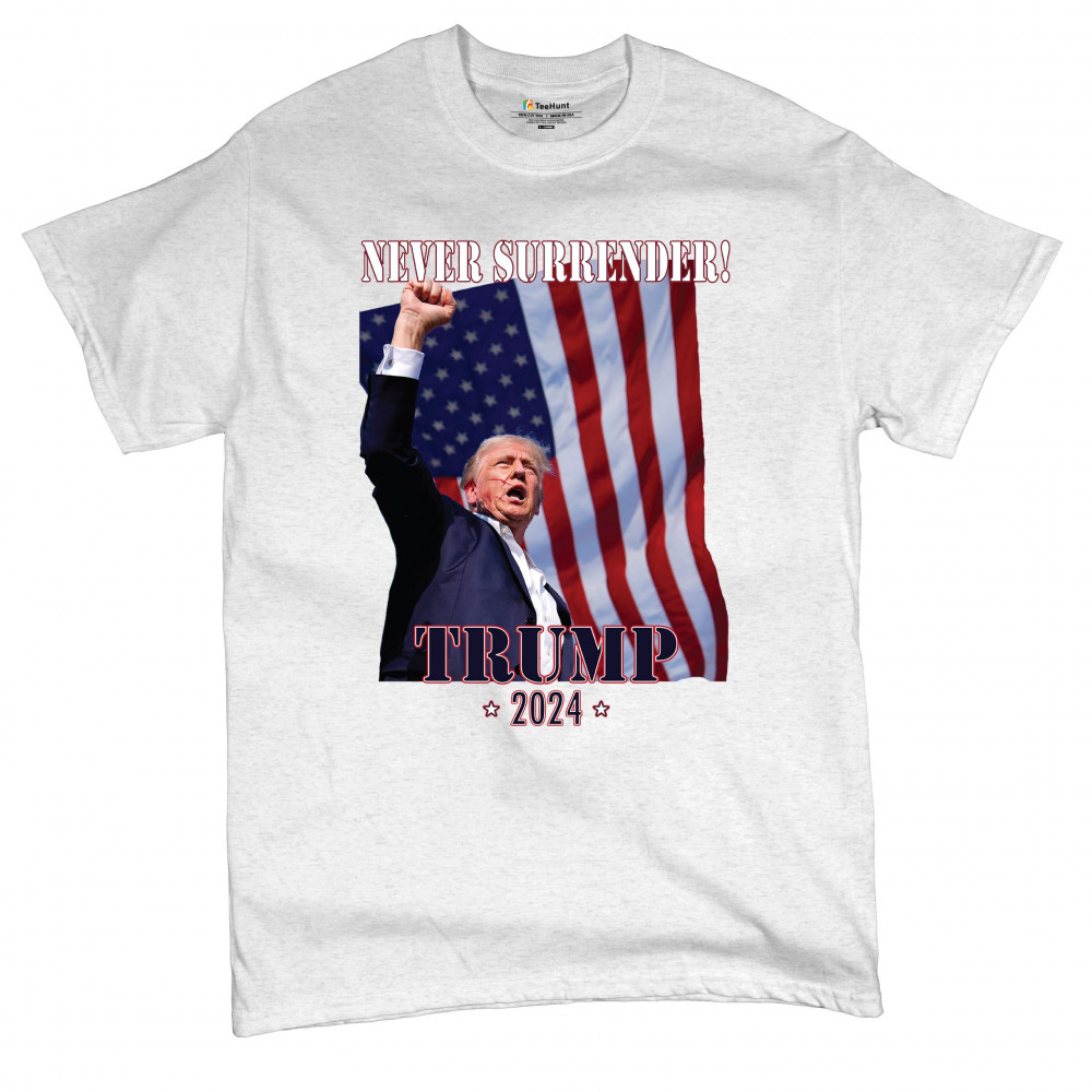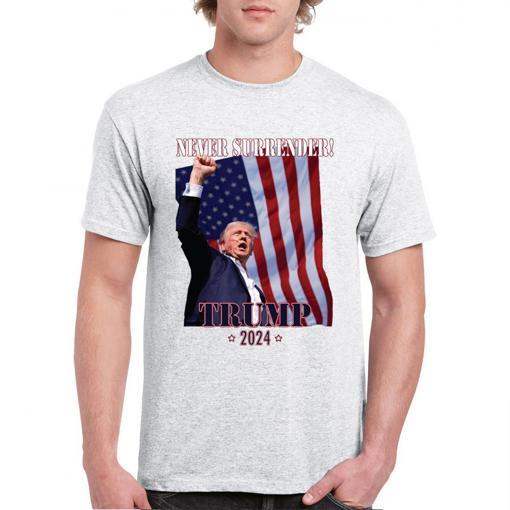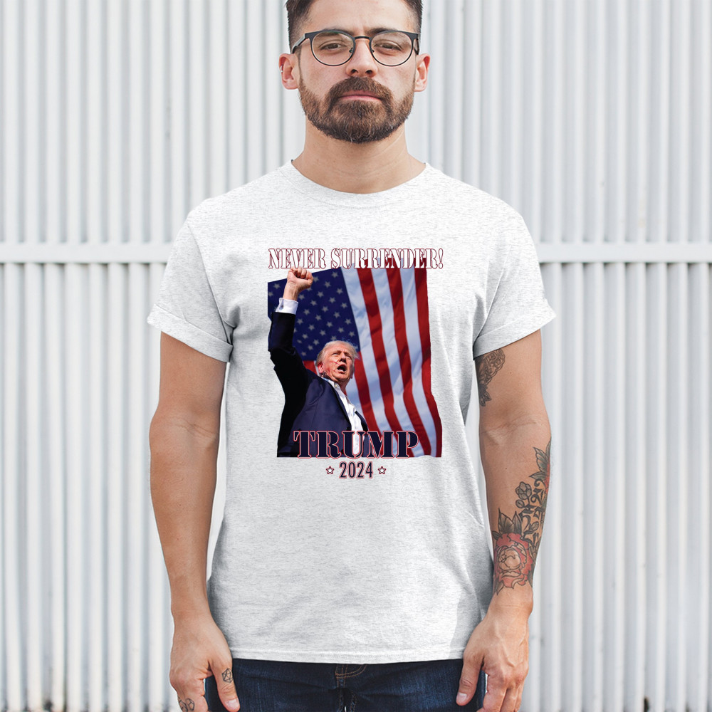 Support Donald Trump with our bold "Never Surrender! Trump 2024" design, featuring Trump against the American flag. Perfect for rallies and everyday wear.