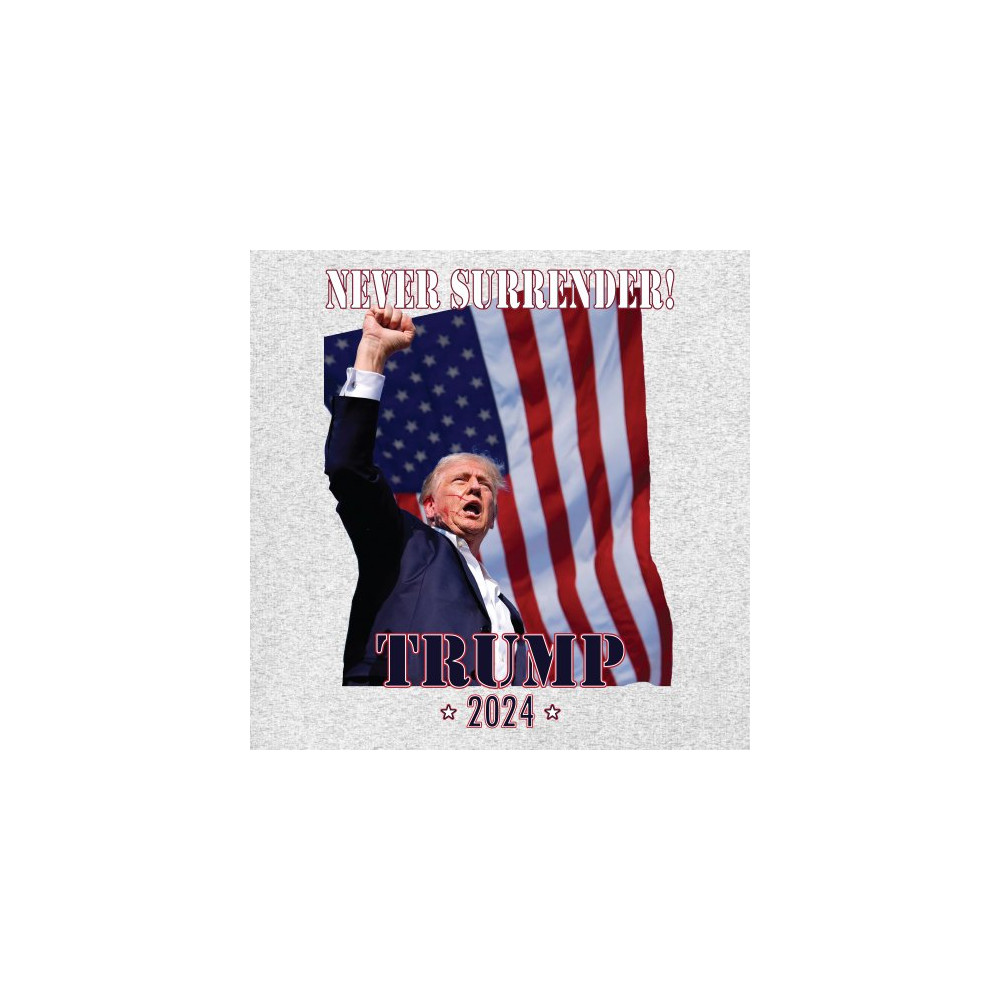 Celebrate your patriotic spirit and political stance with our "Never Surrender! Trump 2024" design. This powerful graphic showcases Donald Trump with a raised fist against the backdrop of the American flag, symbolizing resilience and determination. Ideal for rallies, events, and everyday wear, this design is crafted from premium materials for comfort and durability. Stand out and show your support for America's future with this striking and bold statement piece, perfect for any proud Trump supporter.