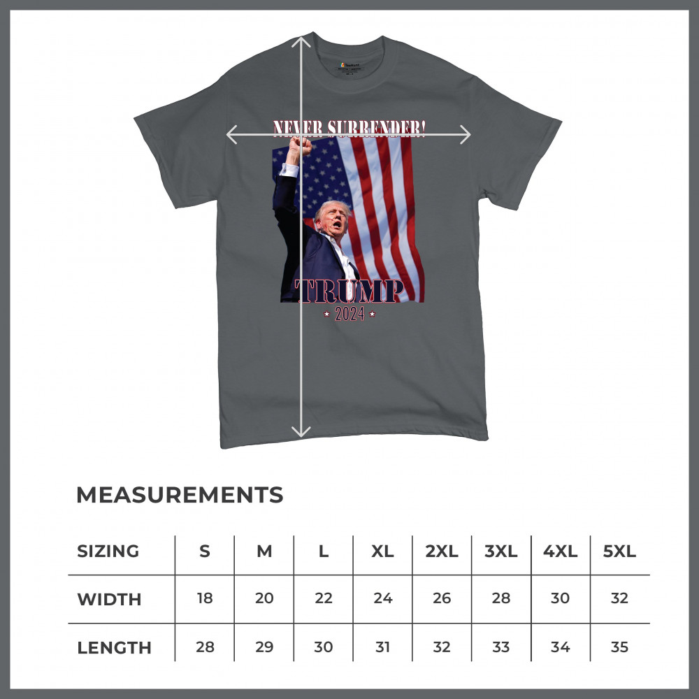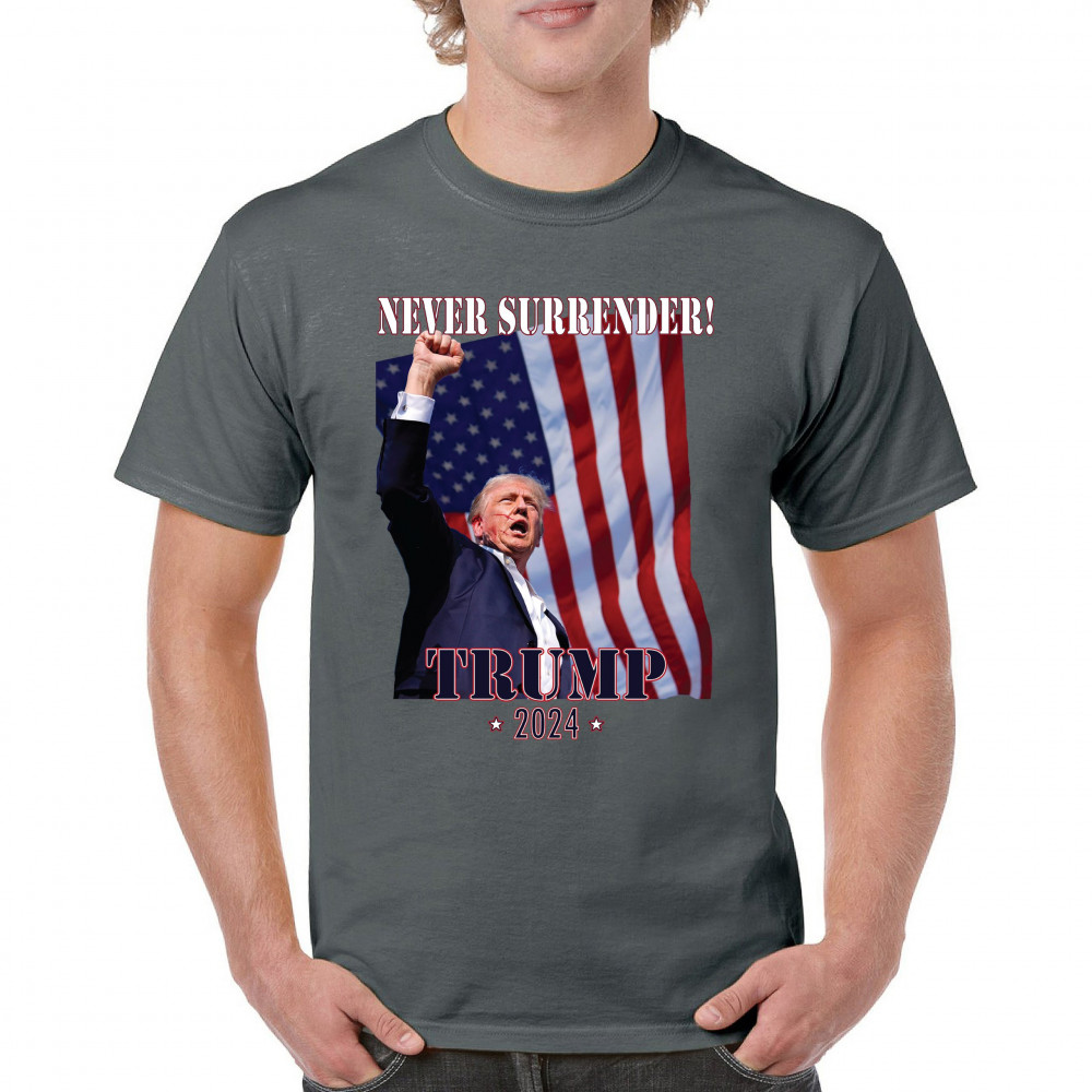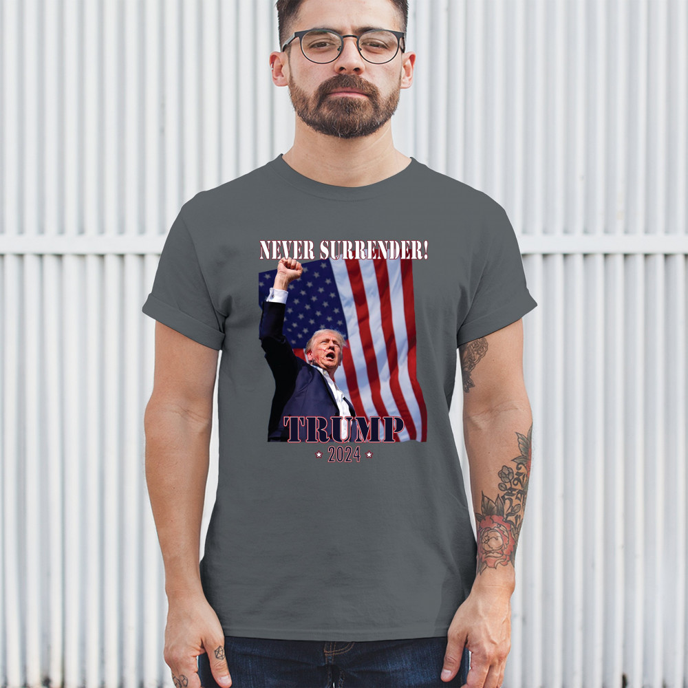 Support Donald Trump with our bold "Never Surrender! Trump 2024" design, featuring Trump against the American flag. Perfect for rallies and everyday wear.