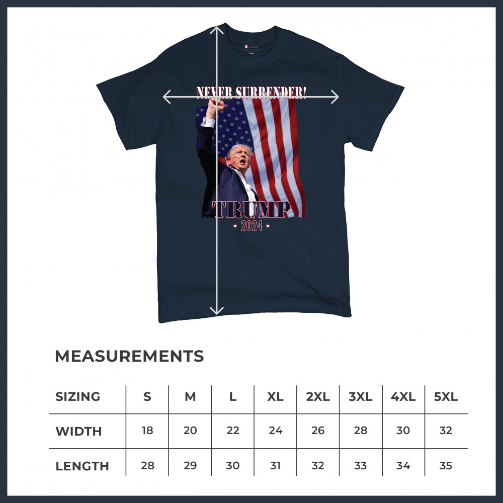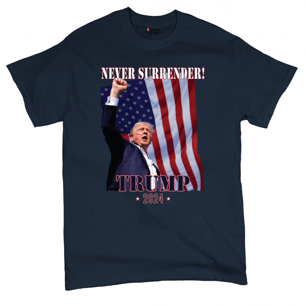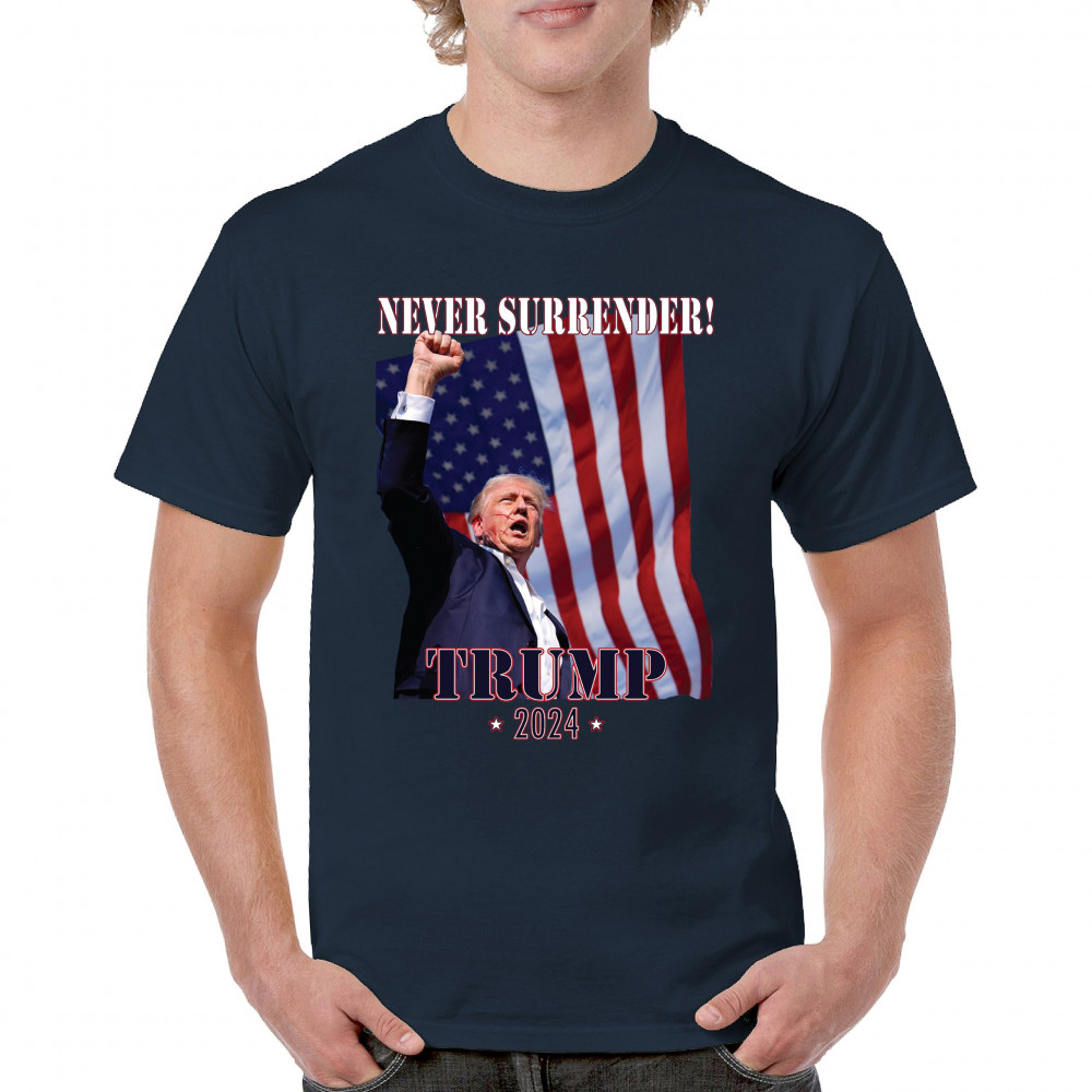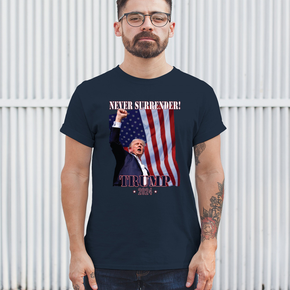 Support Donald Trump with our bold "Never Surrender! Trump 2024" design, featuring Trump against the American flag. Perfect for rallies and everyday wear.