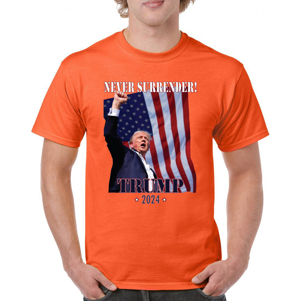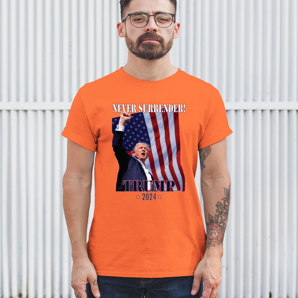 Support Donald Trump with our bold "Never Surrender! Trump 2024" design, featuring Trump against the American flag. Perfect for rallies and everyday wear.