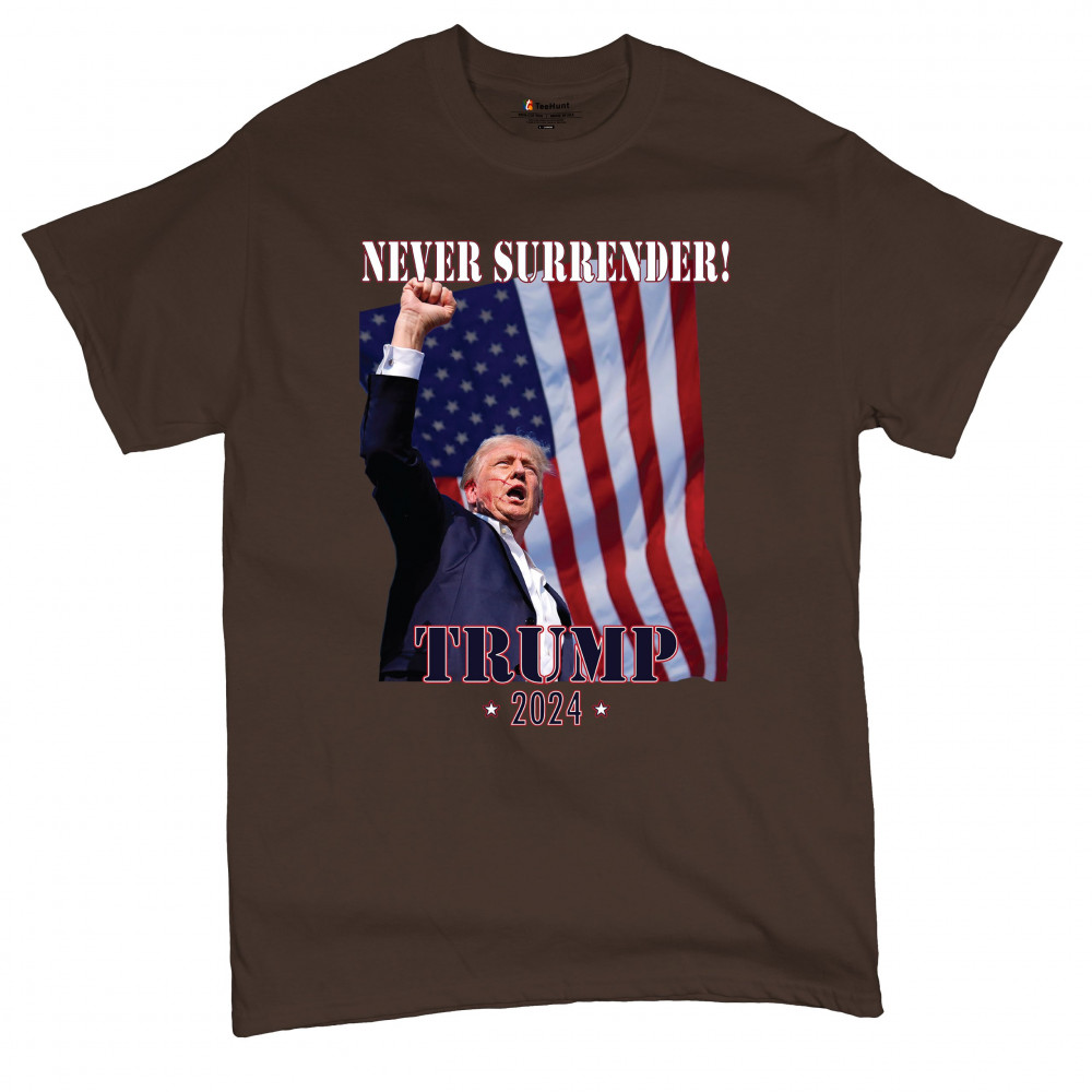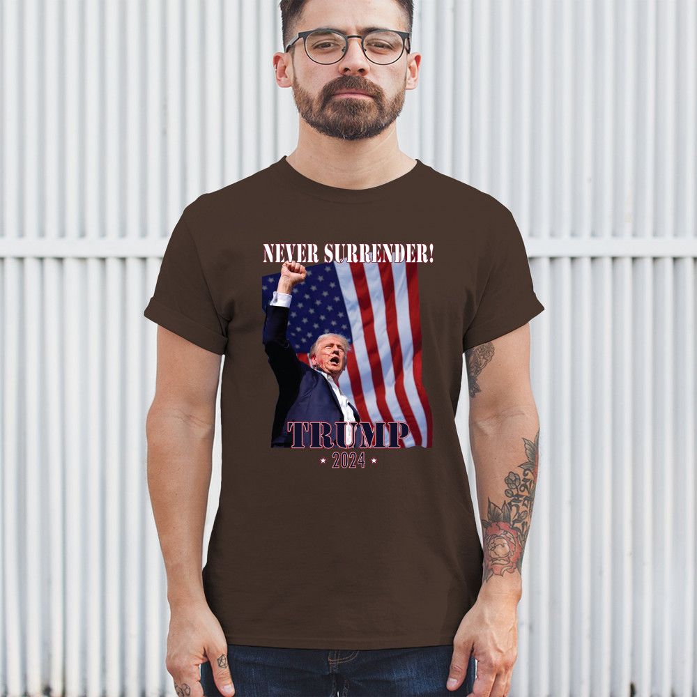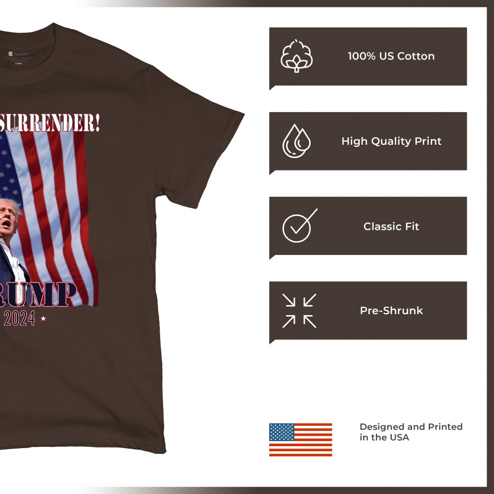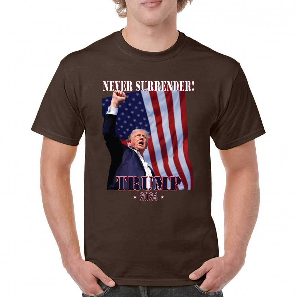 Support Donald Trump with our bold "Never Surrender! Trump 2024" design, featuring Trump against the American flag. Perfect for rallies and everyday wear.