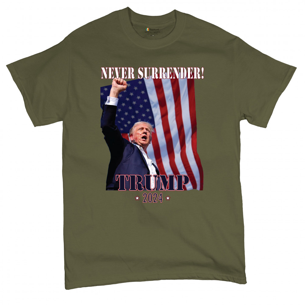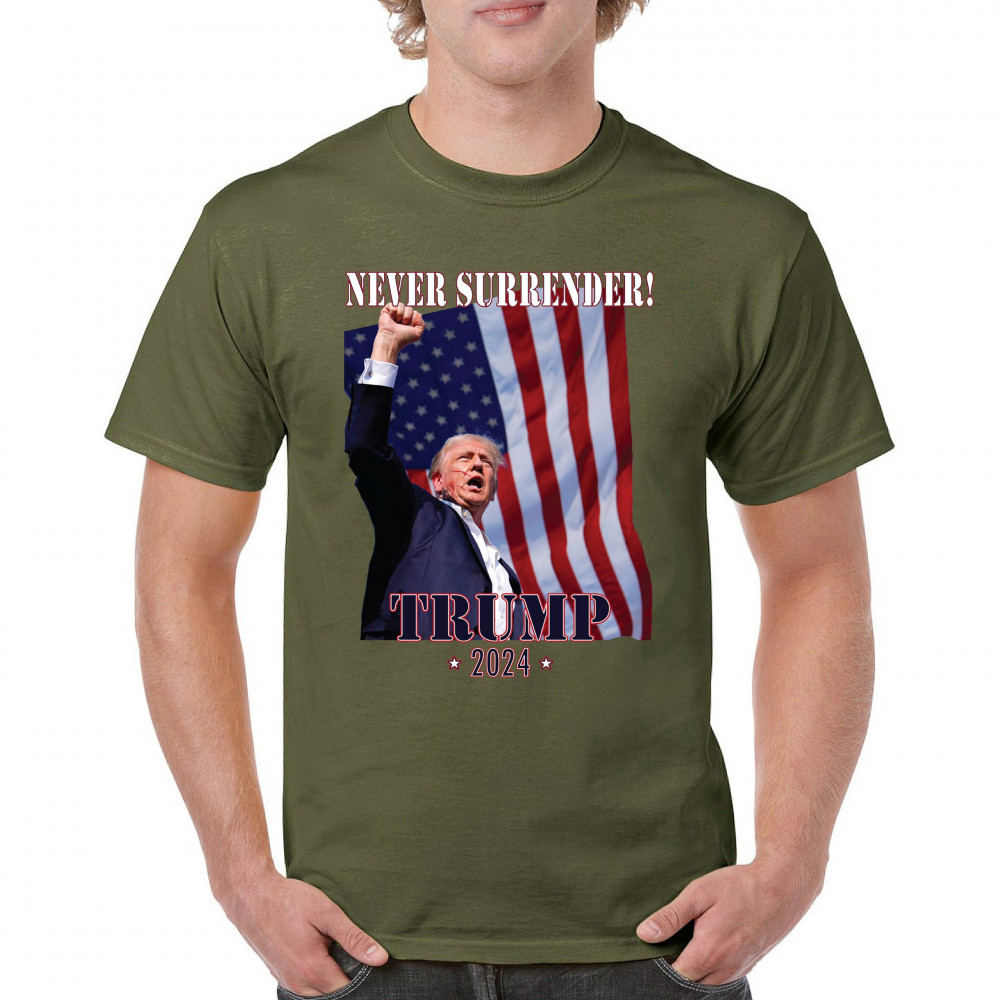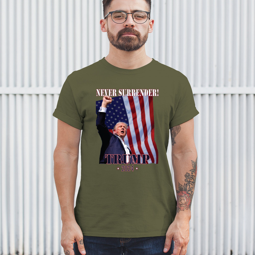 Support Donald Trump with our bold "Never Surrender! Trump 2024" design, featuring Trump against the American flag. Perfect for rallies and everyday wear.