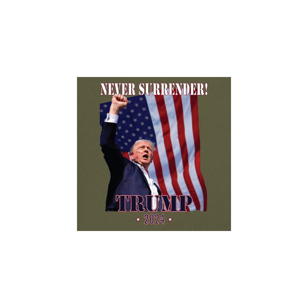 Celebrate your patriotic spirit and political stance with our "Never Surrender! Trump 2024" design. This powerful graphic showcases Donald Trump with a raised fist against the backdrop of the American flag, symbolizing resilience and determination. Ideal for rallies, events, and everyday wear, this design is crafted from premium materials for comfort and durability. Stand out and show your support for America's future with this striking and bold statement piece, perfect for any proud Trump supporter.