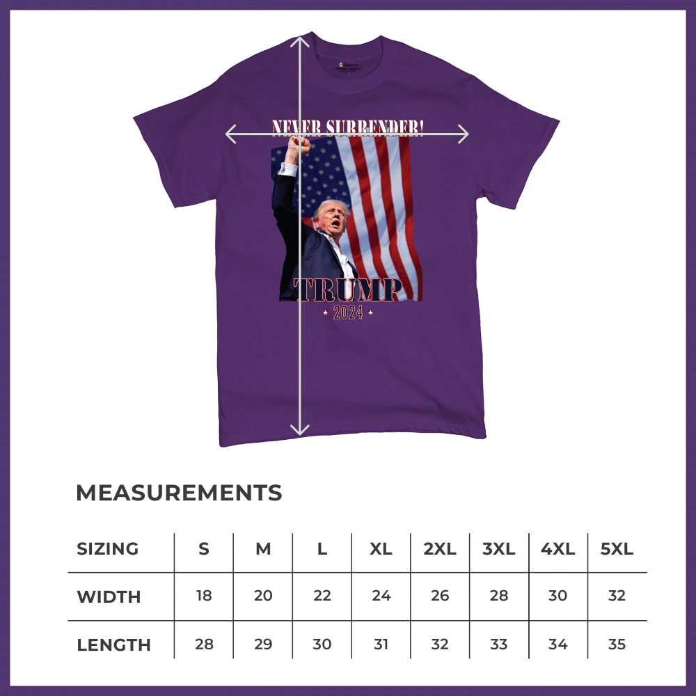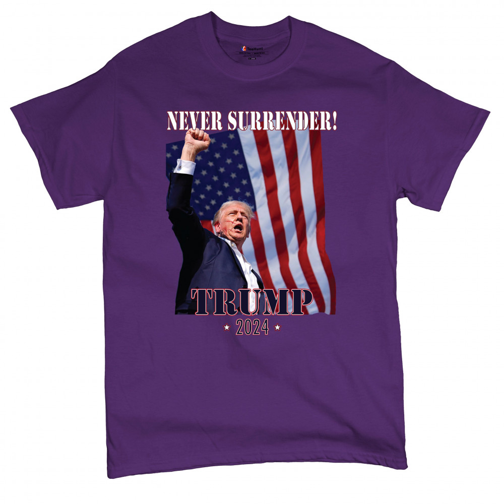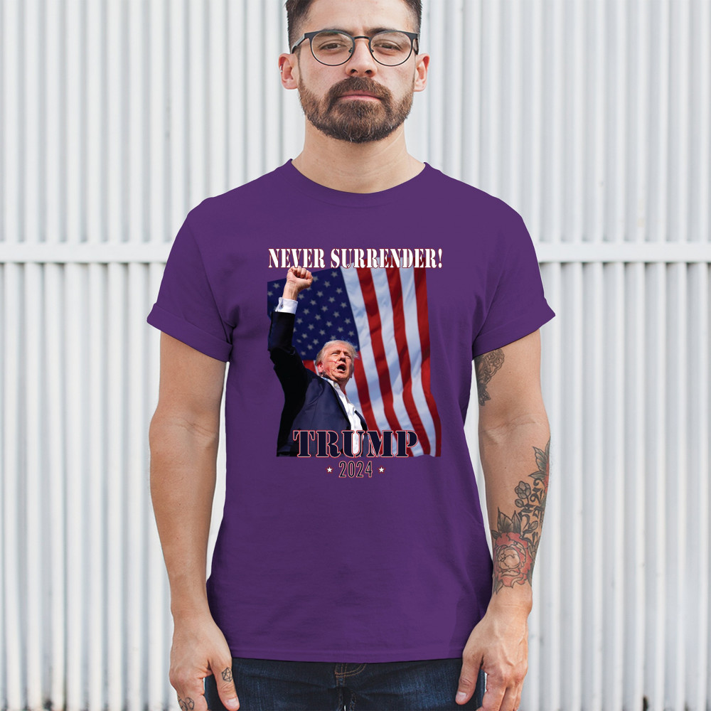 Support Donald Trump with our bold "Never Surrender! Trump 2024" design, featuring Trump against the American flag. Perfect for rallies and everyday wear.