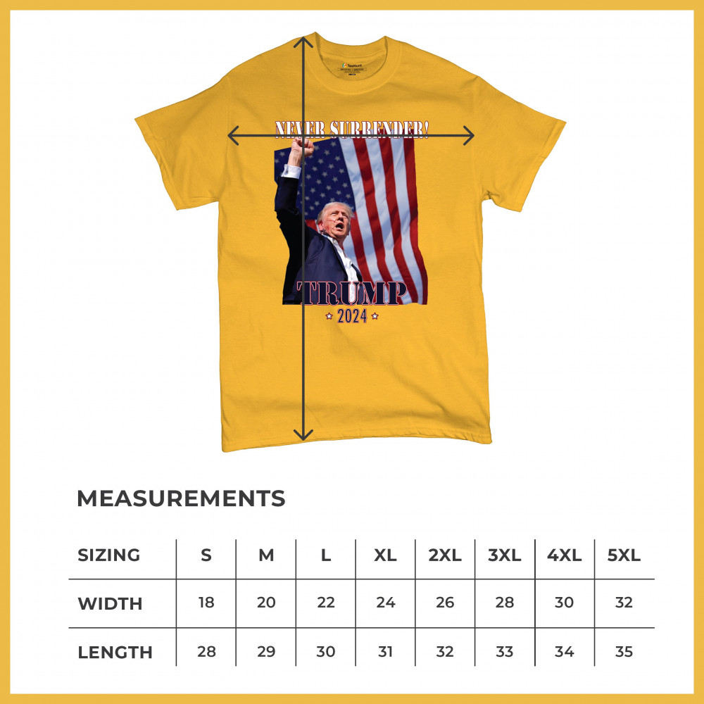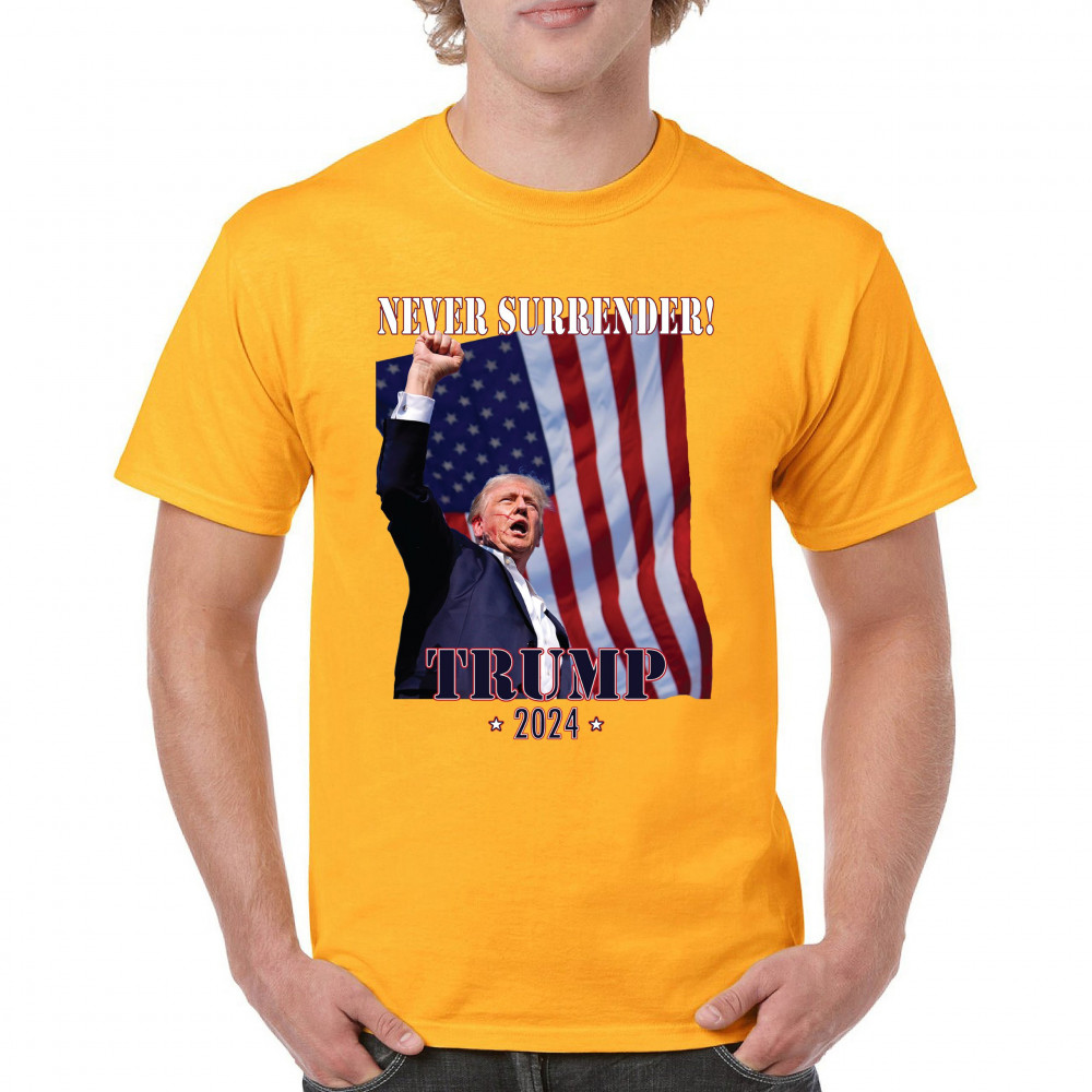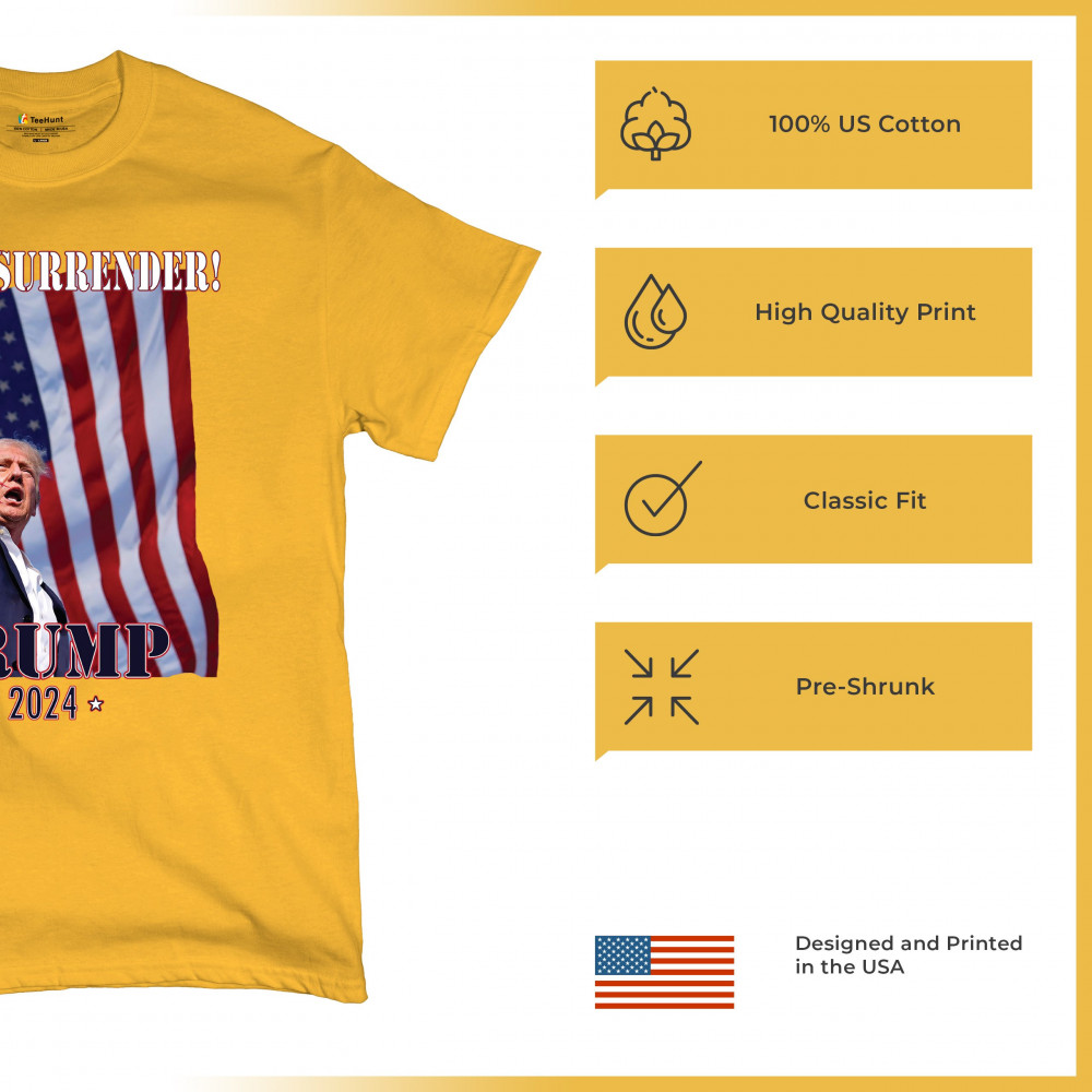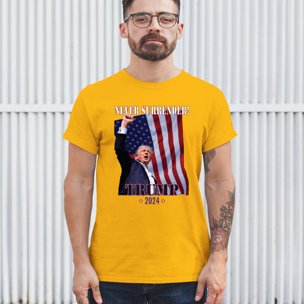 Support Donald Trump with our bold "Never Surrender! Trump 2024" design, featuring Trump against the American flag. Perfect for rallies and everyday wear.