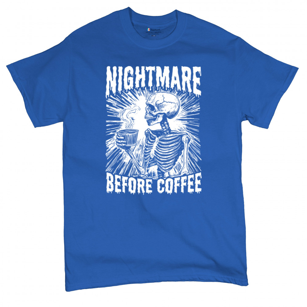 Show off your love for coffee with this quirky "Nightmare Before Coffee" skeleton design, blending humor and gothic style for caffeine lovers.