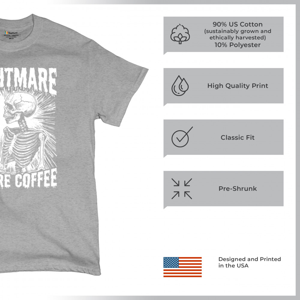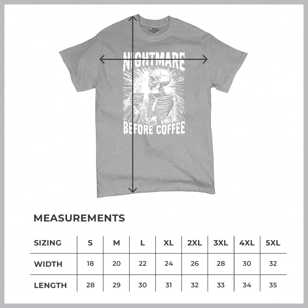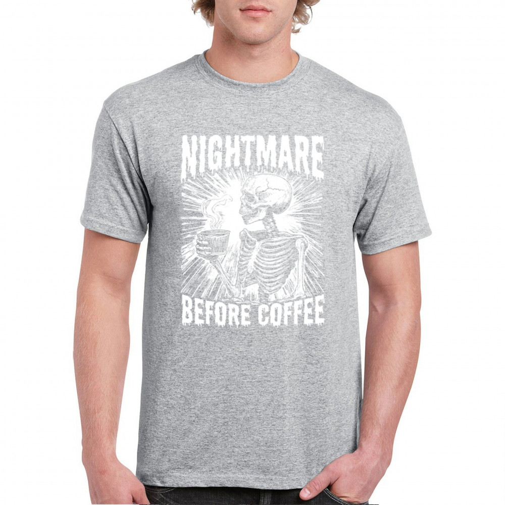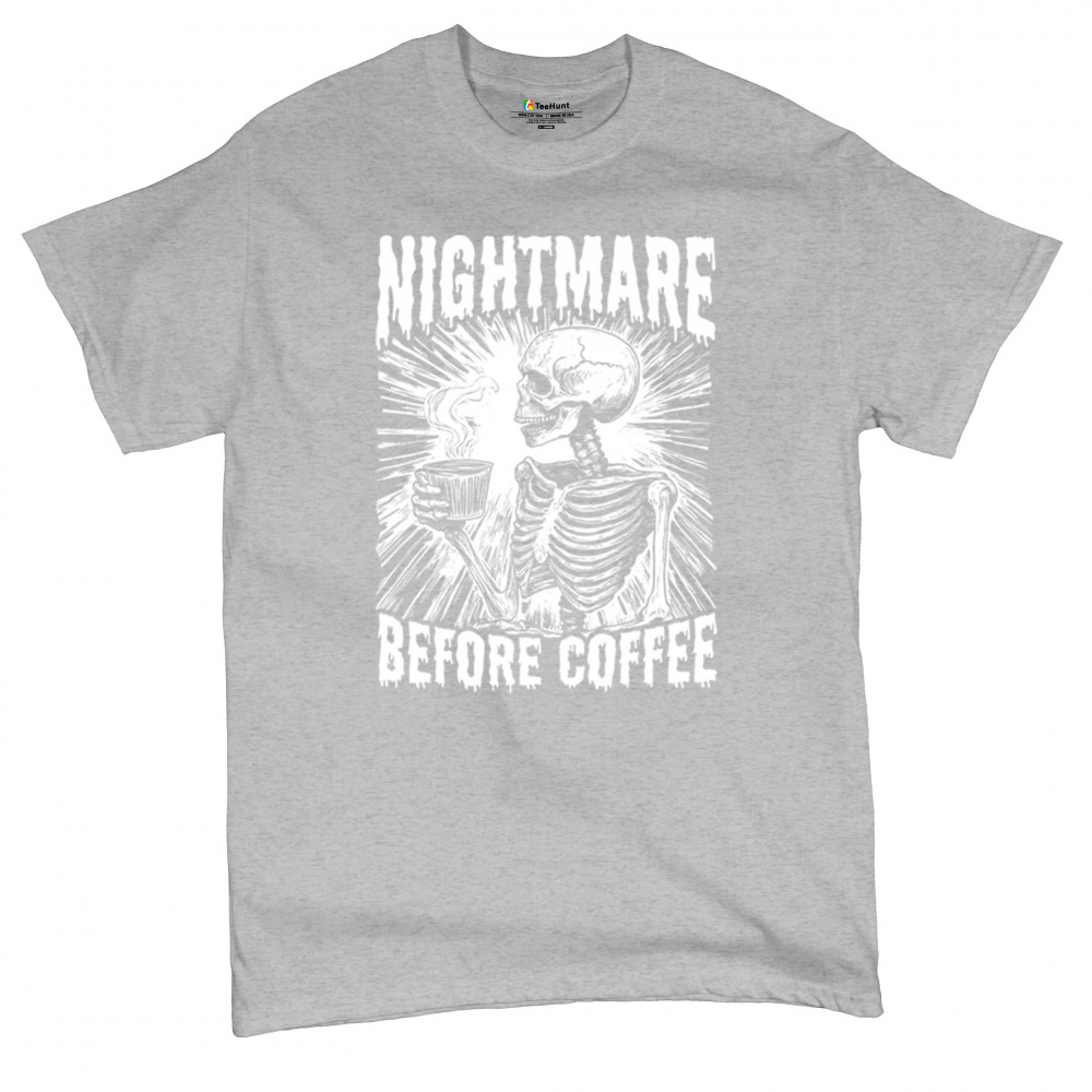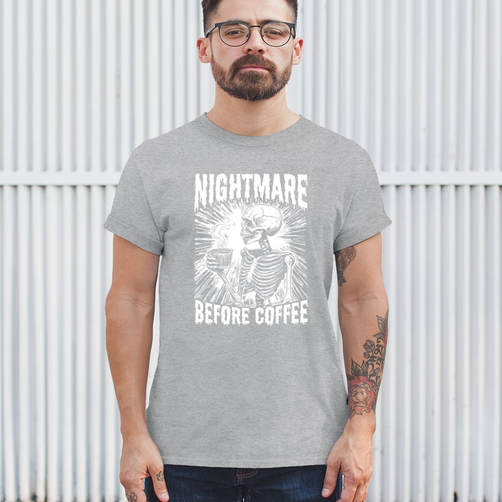 Show off your love for coffee with this quirky "Nightmare Before Coffee" skeleton design, blending humor and gothic style for caffeine lovers.