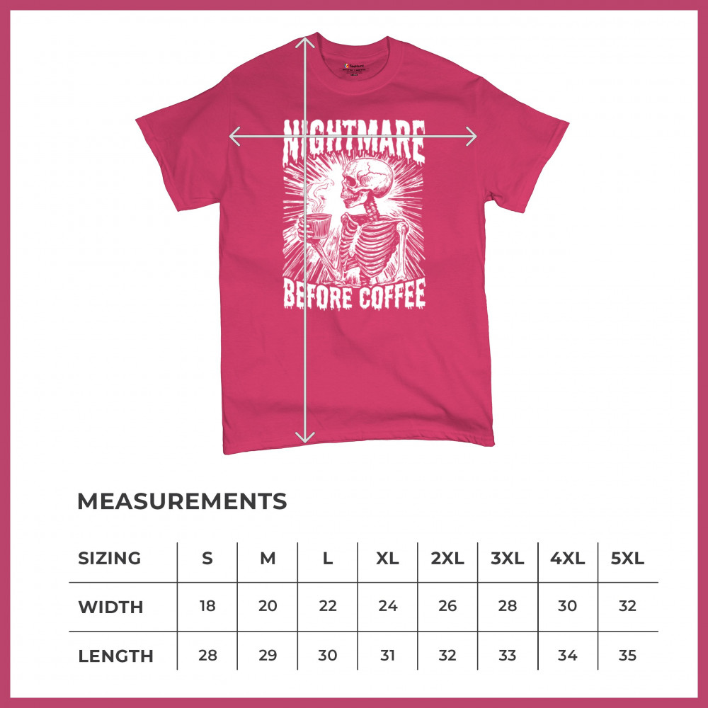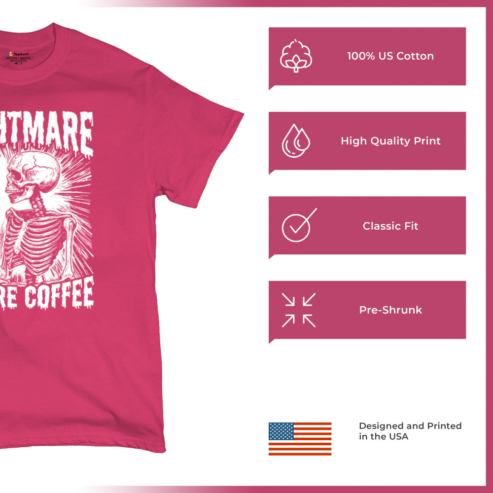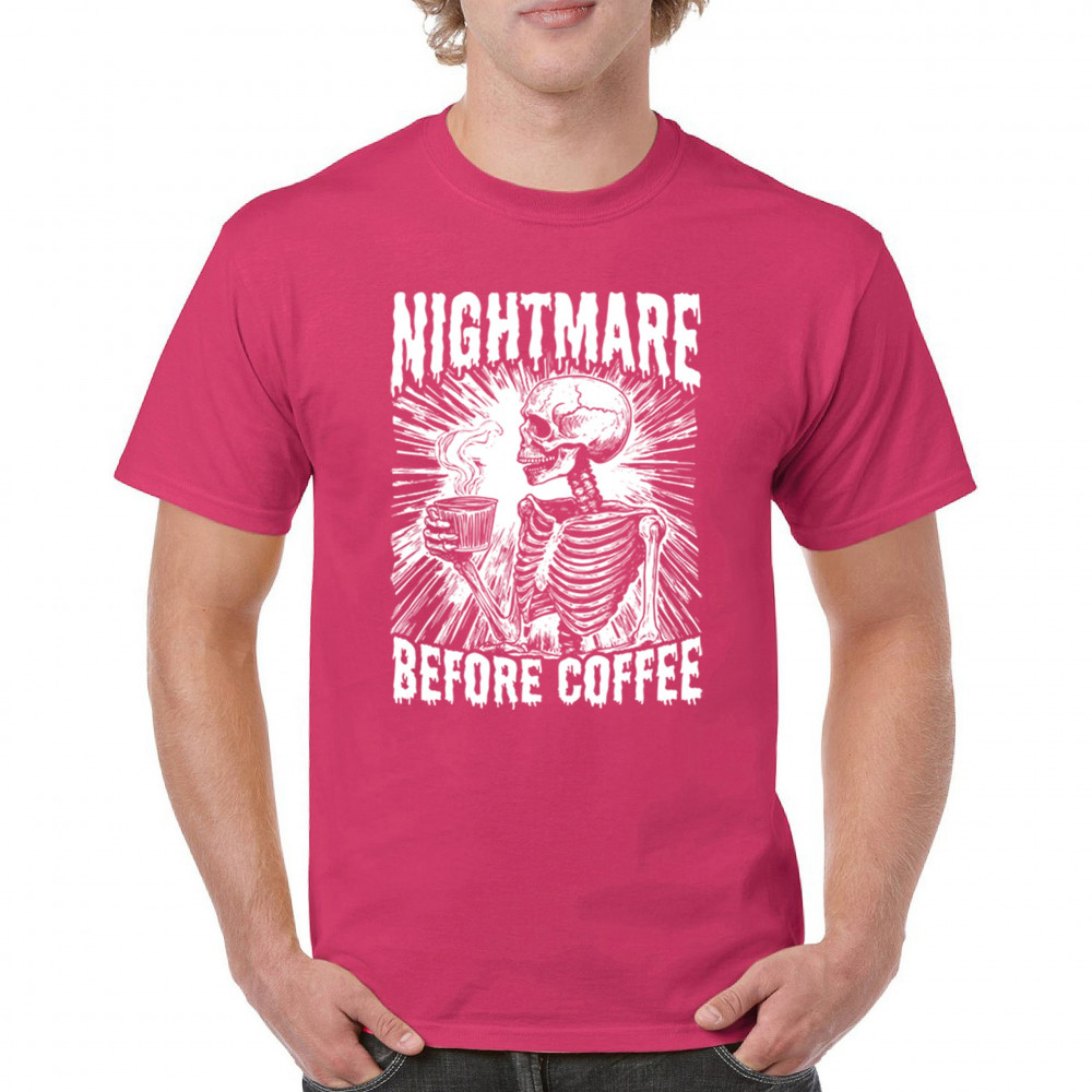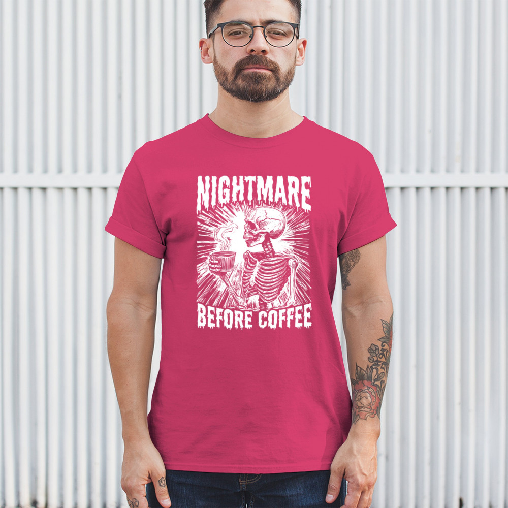 Show off your love for coffee with this quirky "Nightmare Before Coffee" skeleton design, blending humor and gothic style for caffeine lovers.