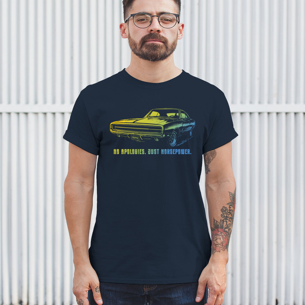 Bold 1970 muscle car design with gradient pop. No apologies, just horsepower—perfect for car shows, gearheads, and performance lovers.