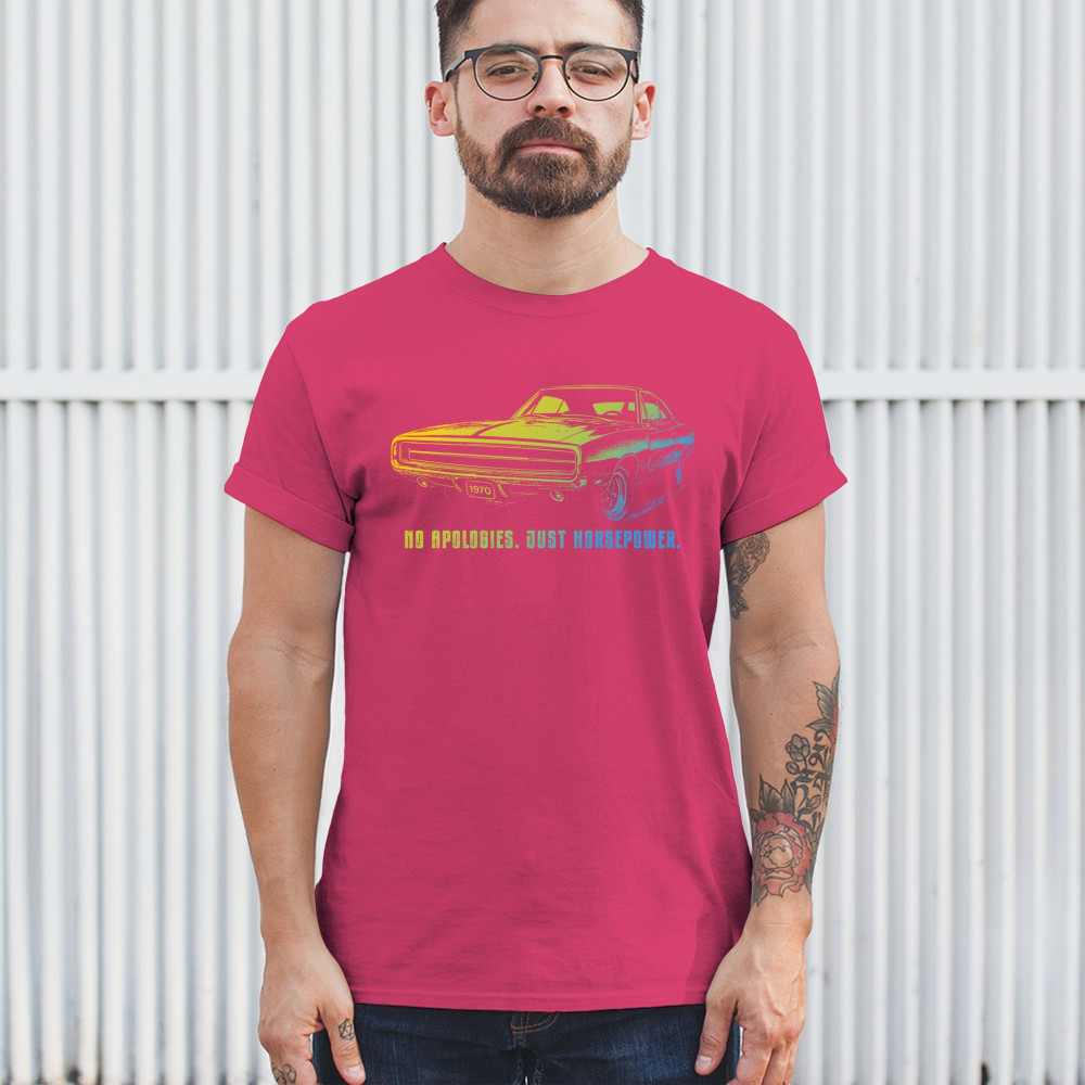 Bold 1970 muscle car design with gradient pop. No apologies, just horsepower—perfect for car shows, gearheads, and performance lovers.