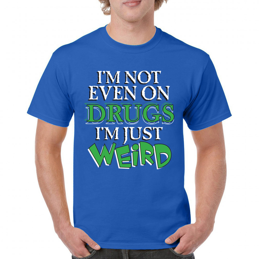 Bold weird design for introverts and quirky minds. Says “I'm not even on drugs I'm just weirdâ€â€”perfect for awkward humor and loud energy.