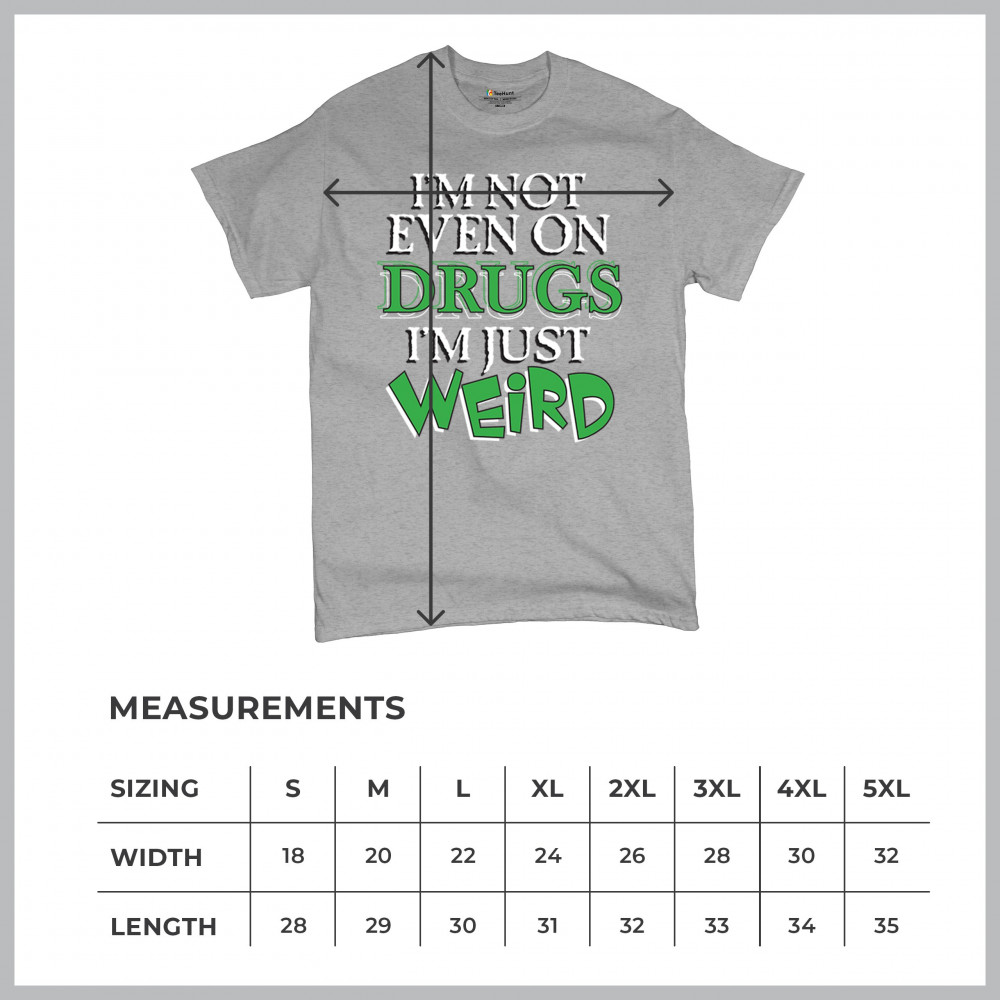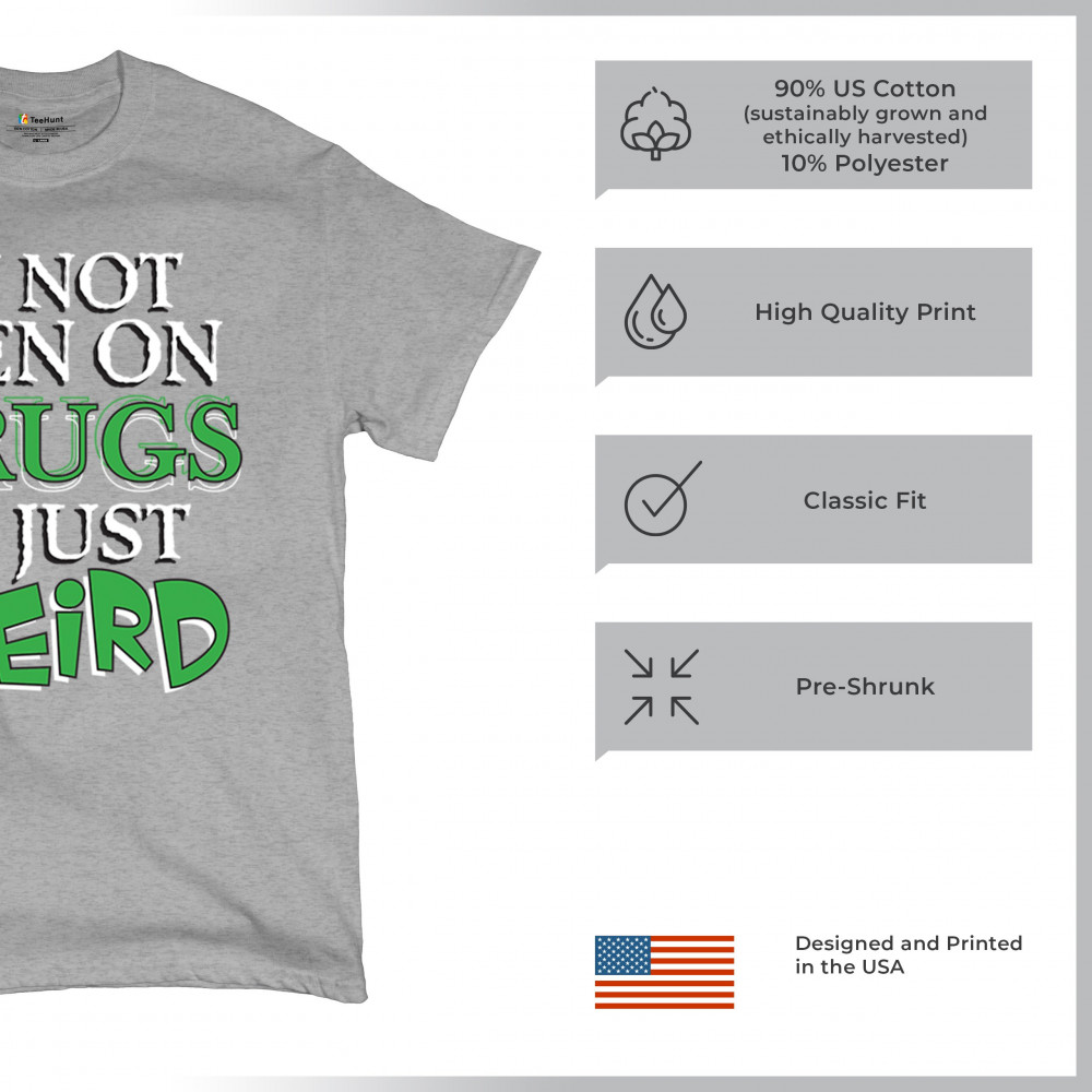 Bold weird design for introverts and quirky minds. Says “I'm not even on drugs I'm just weirdâ€â€”perfect for awkward humor and loud energy.