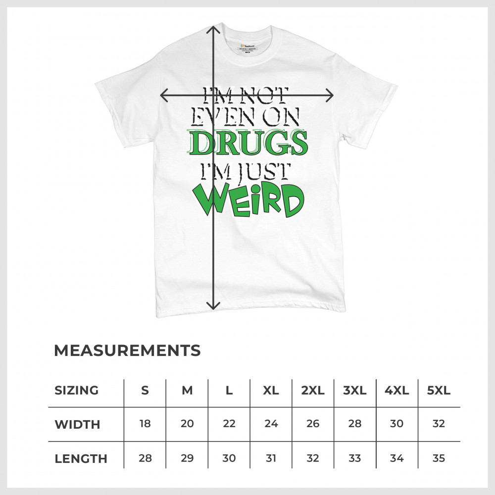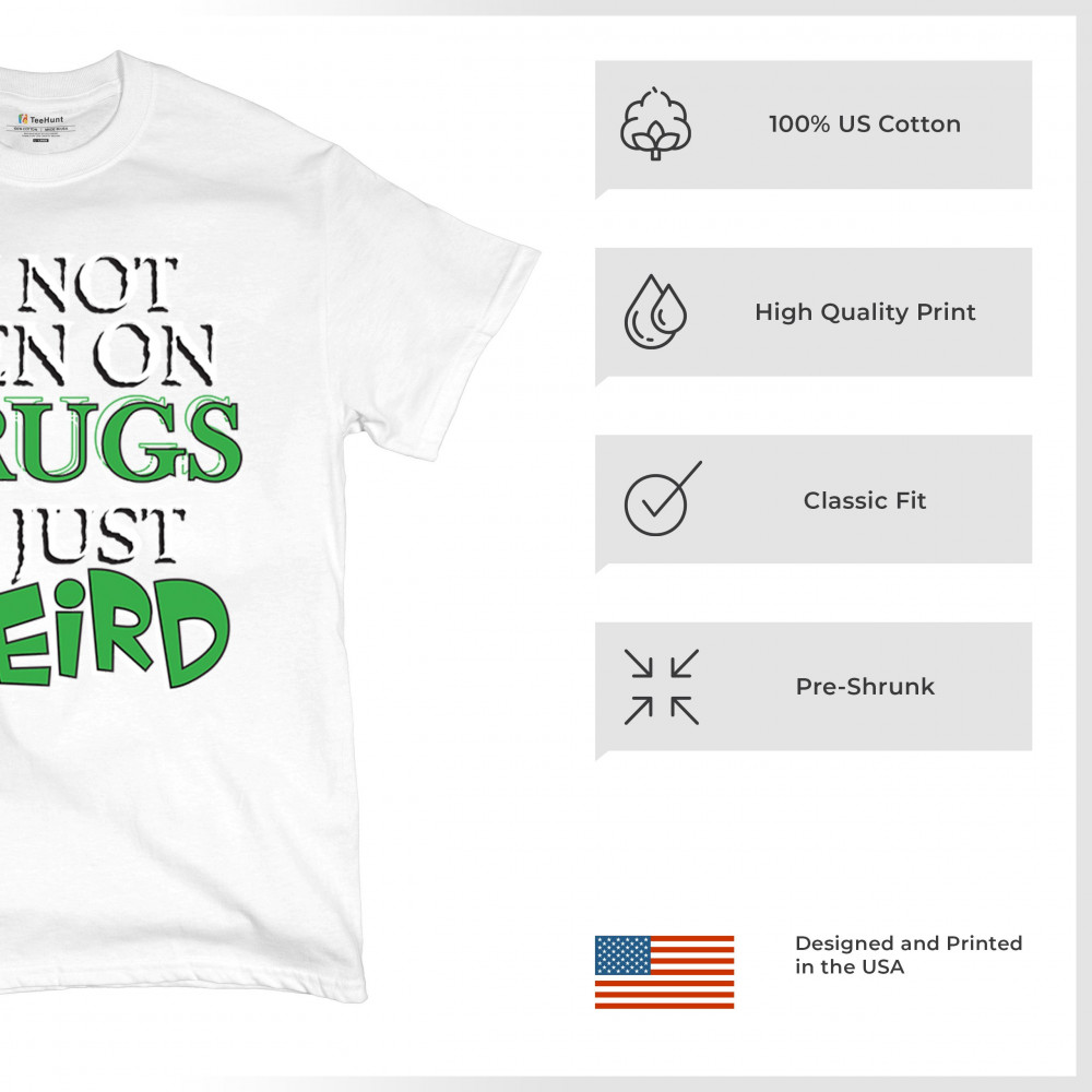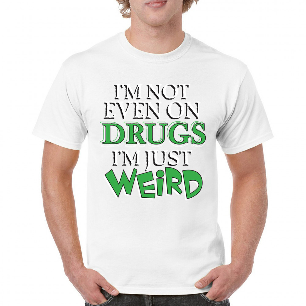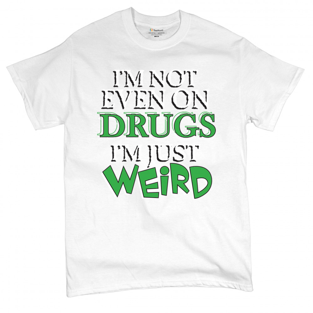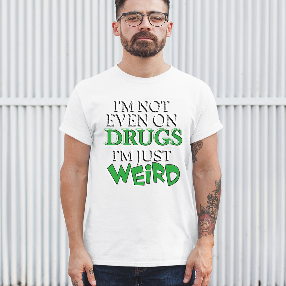 Bold weird design for introverts and quirky minds. Says “I'm not even on drugs I'm just weirdâ€â€”perfect for awkward humor and loud energy.
